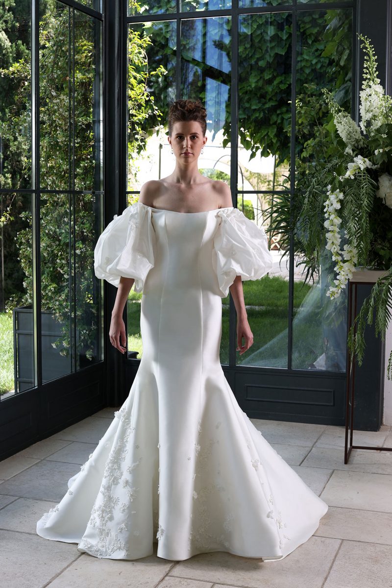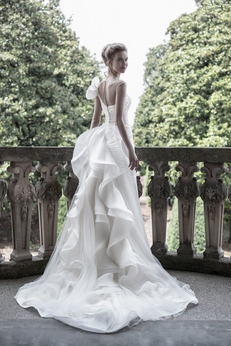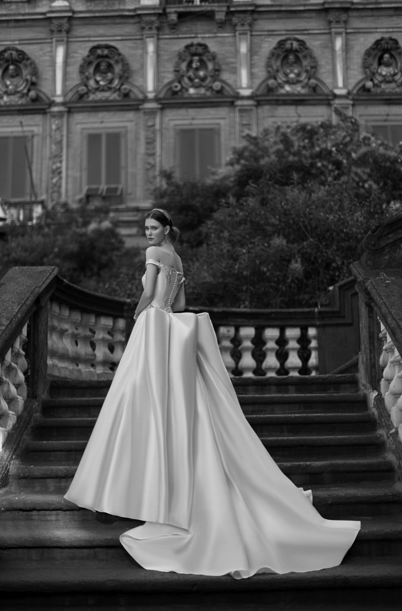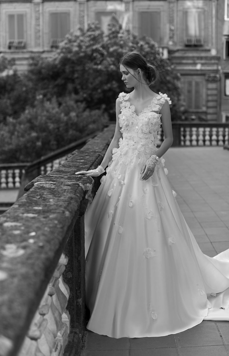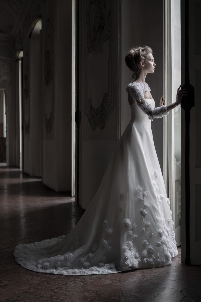 Elegante abito con scenografica coda staccabile, impreziosito da ricami floreali tridimensionali.