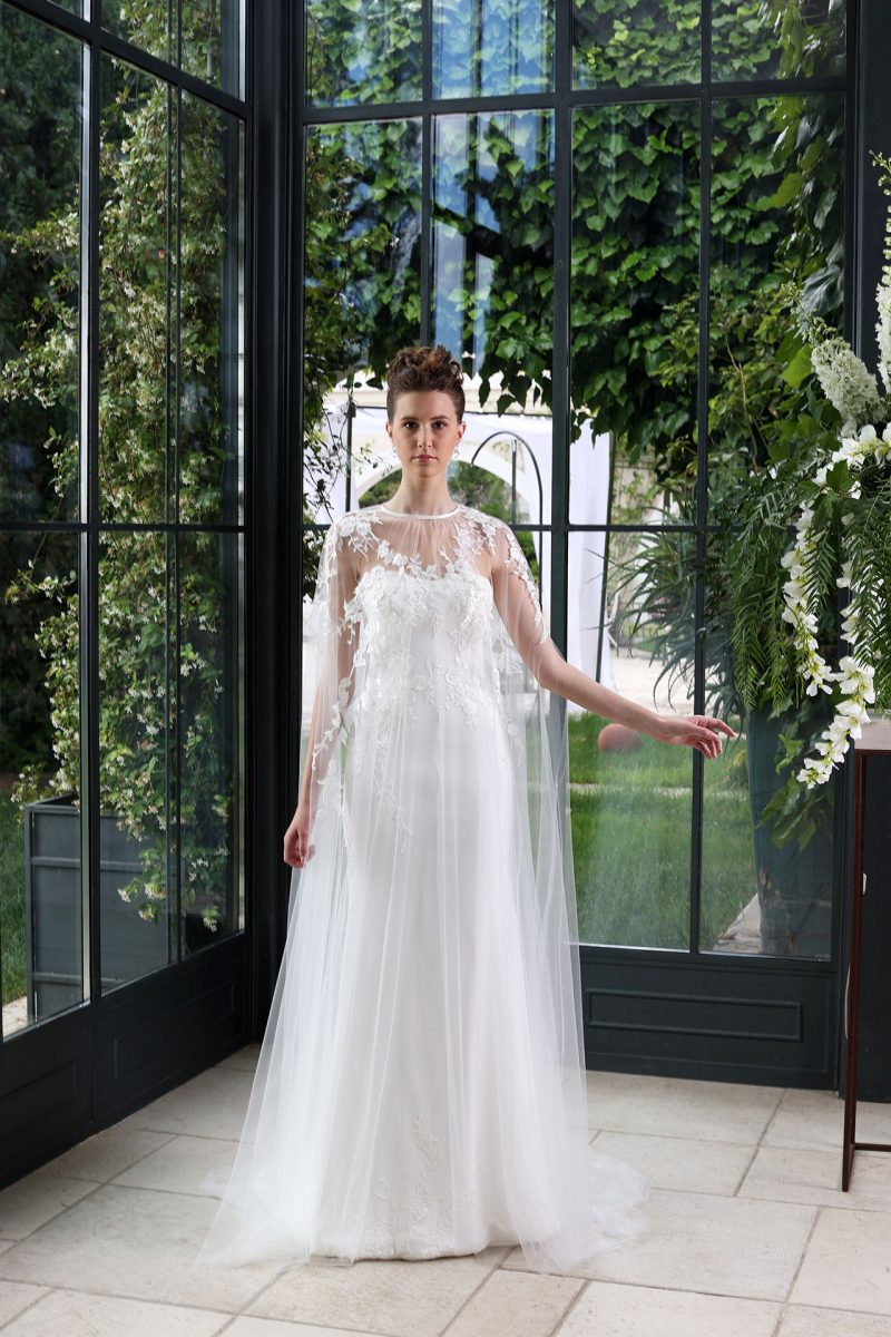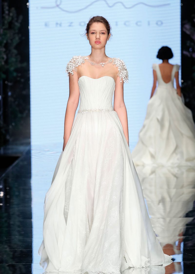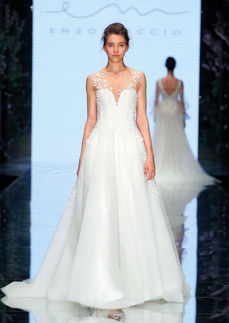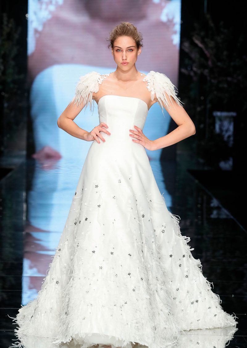 Elegante abito con scenografica coda staccabile, impreziosito da ricami floreali tridimensionali.