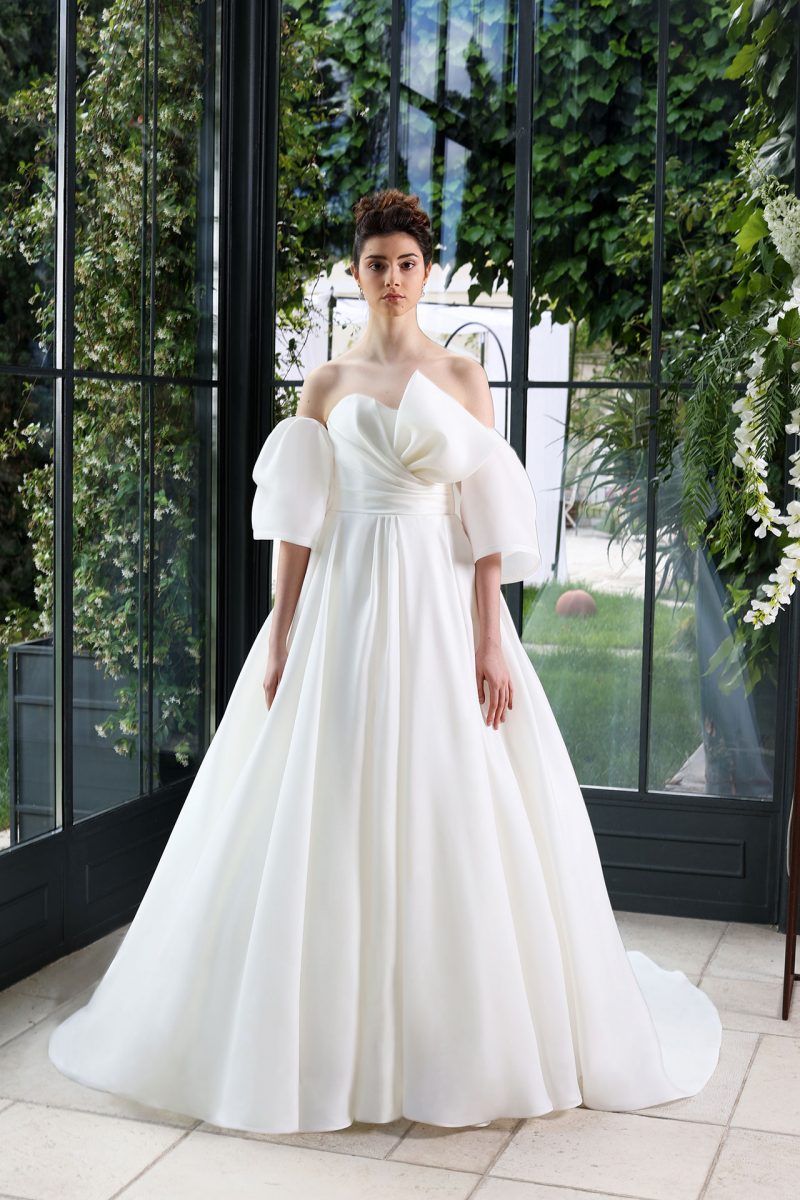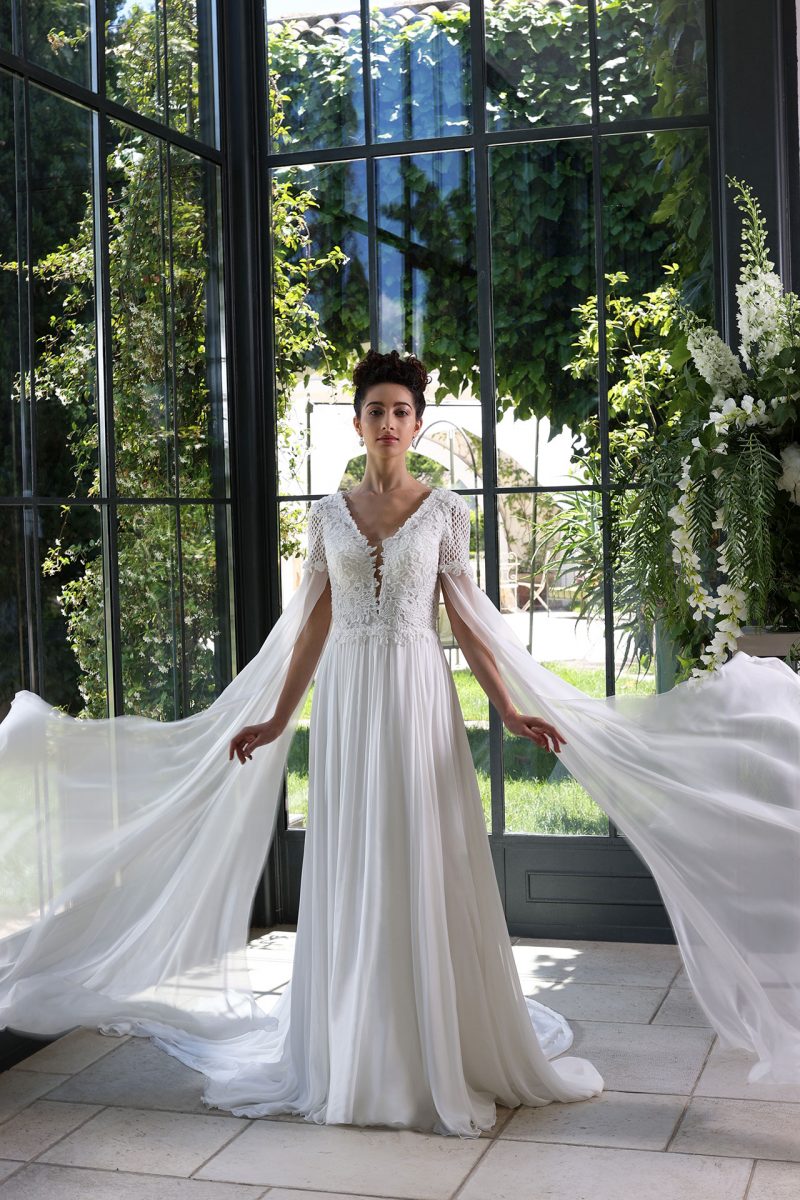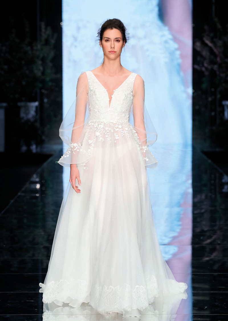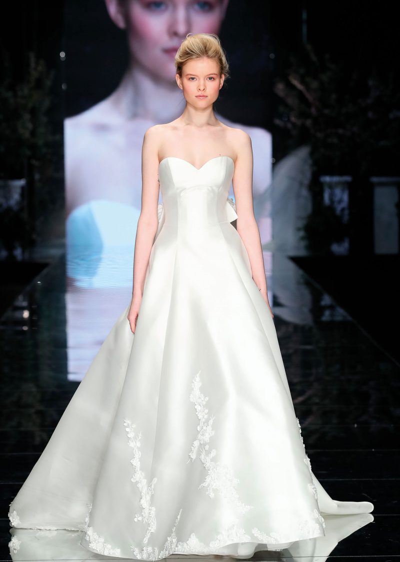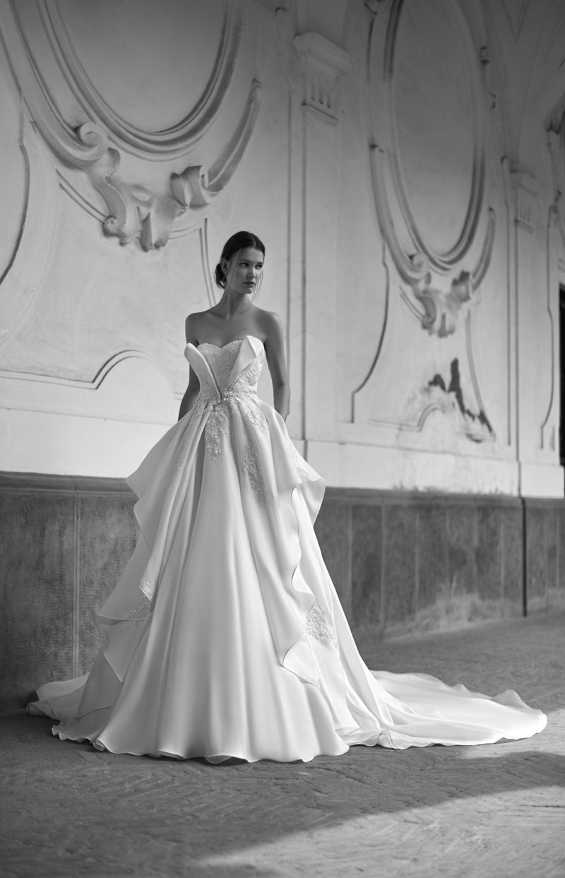 Elegante abito con scenografica coda staccabile, impreziosito da ricami floreali tridimensionali.