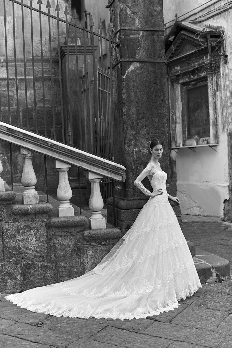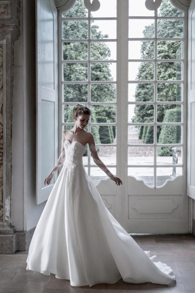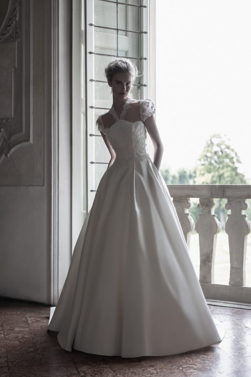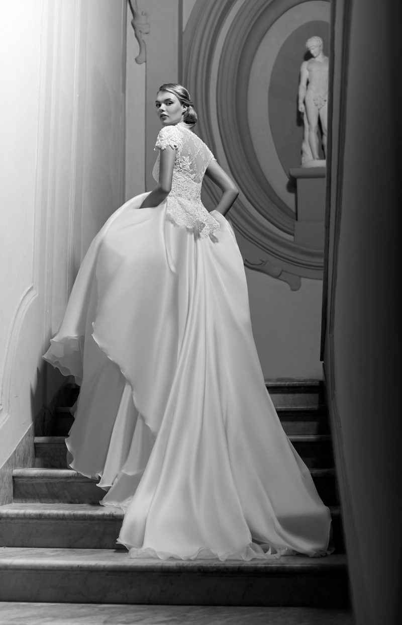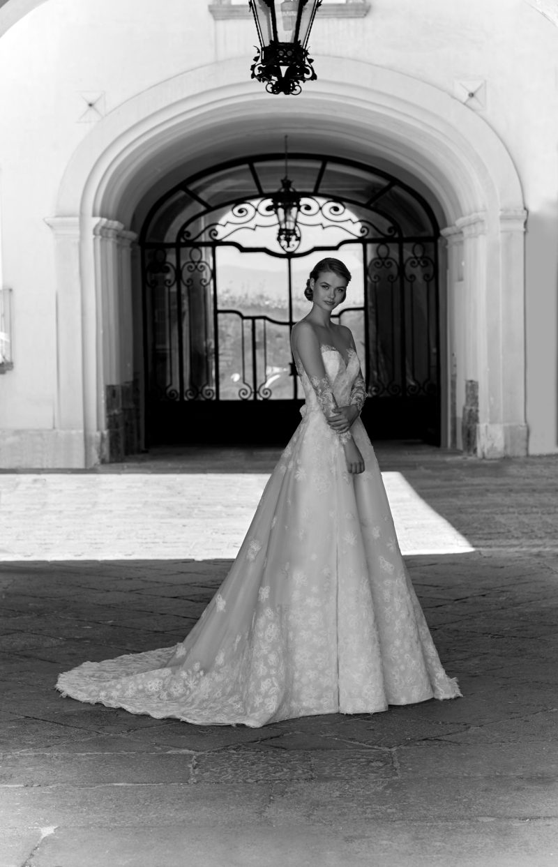 Abito con preziosi ricami e ampia coda staccabile.