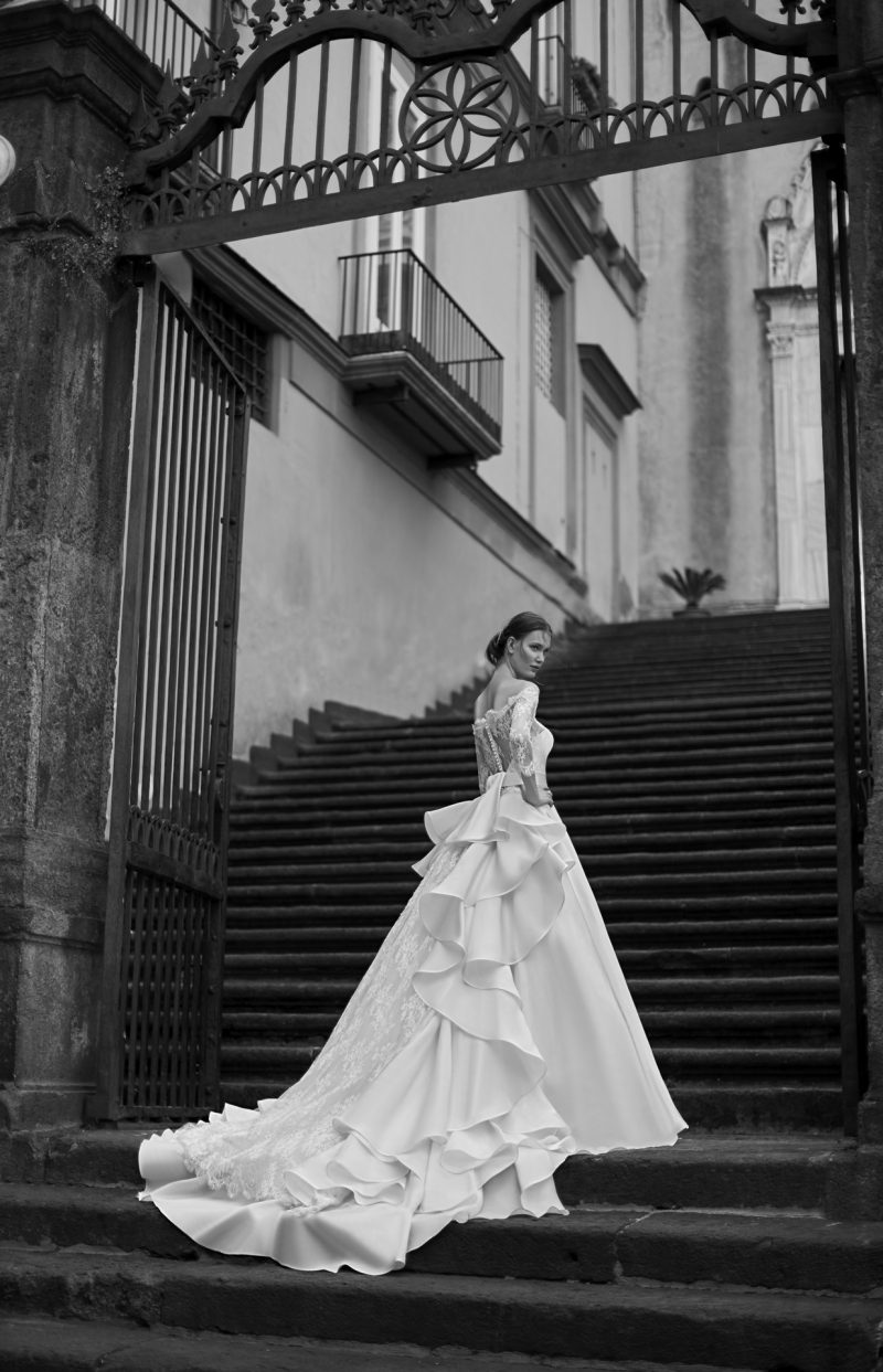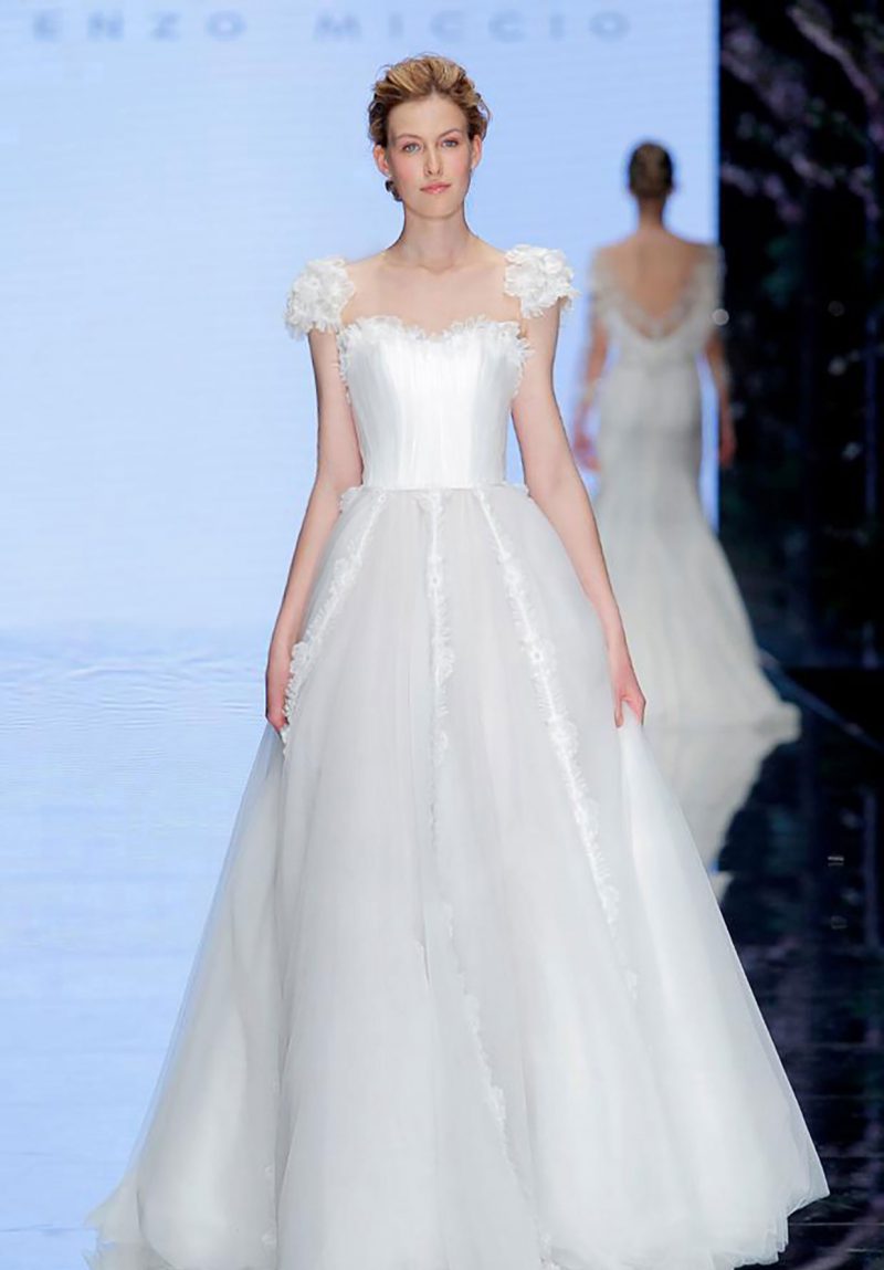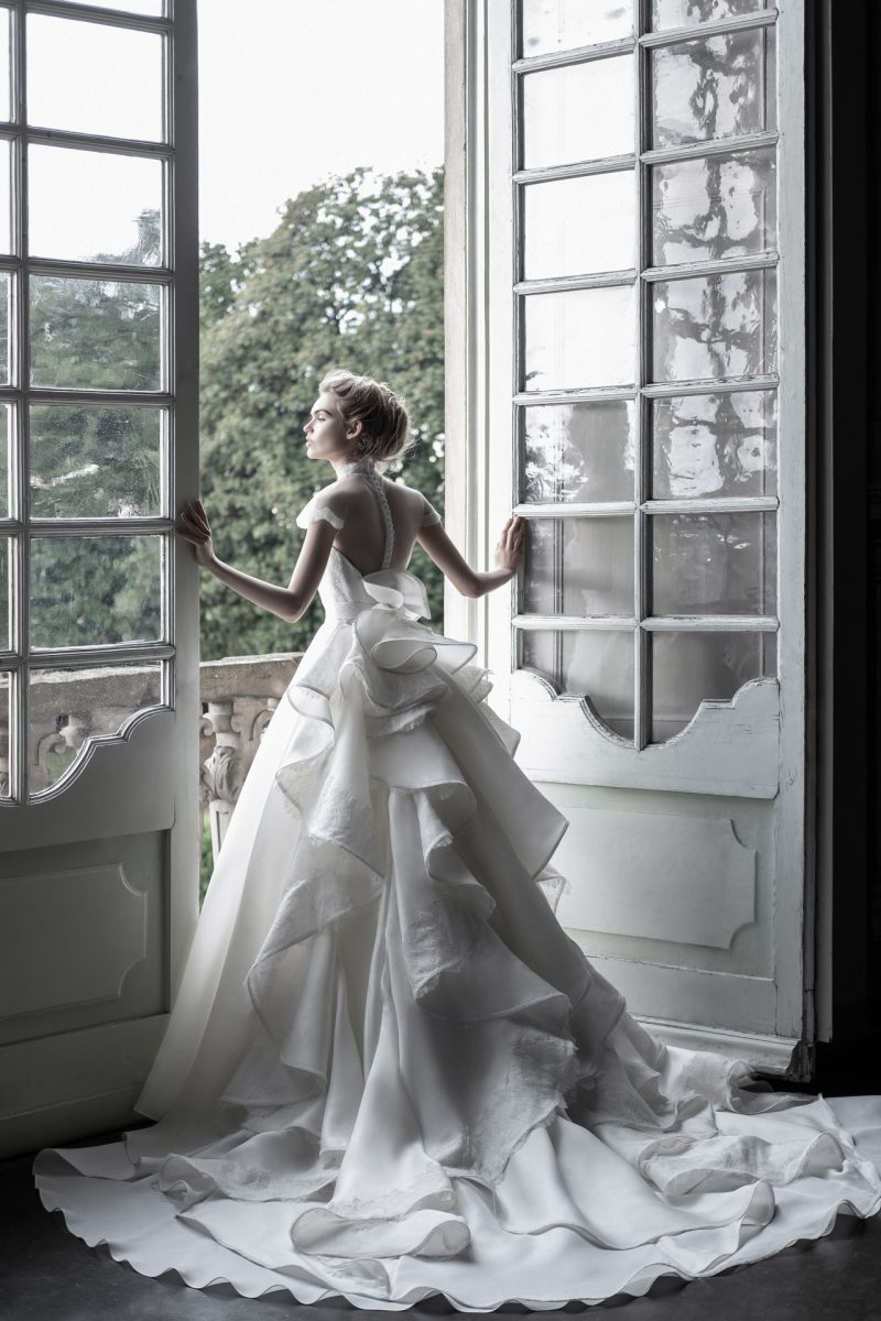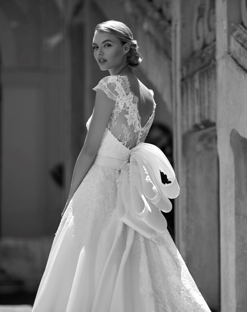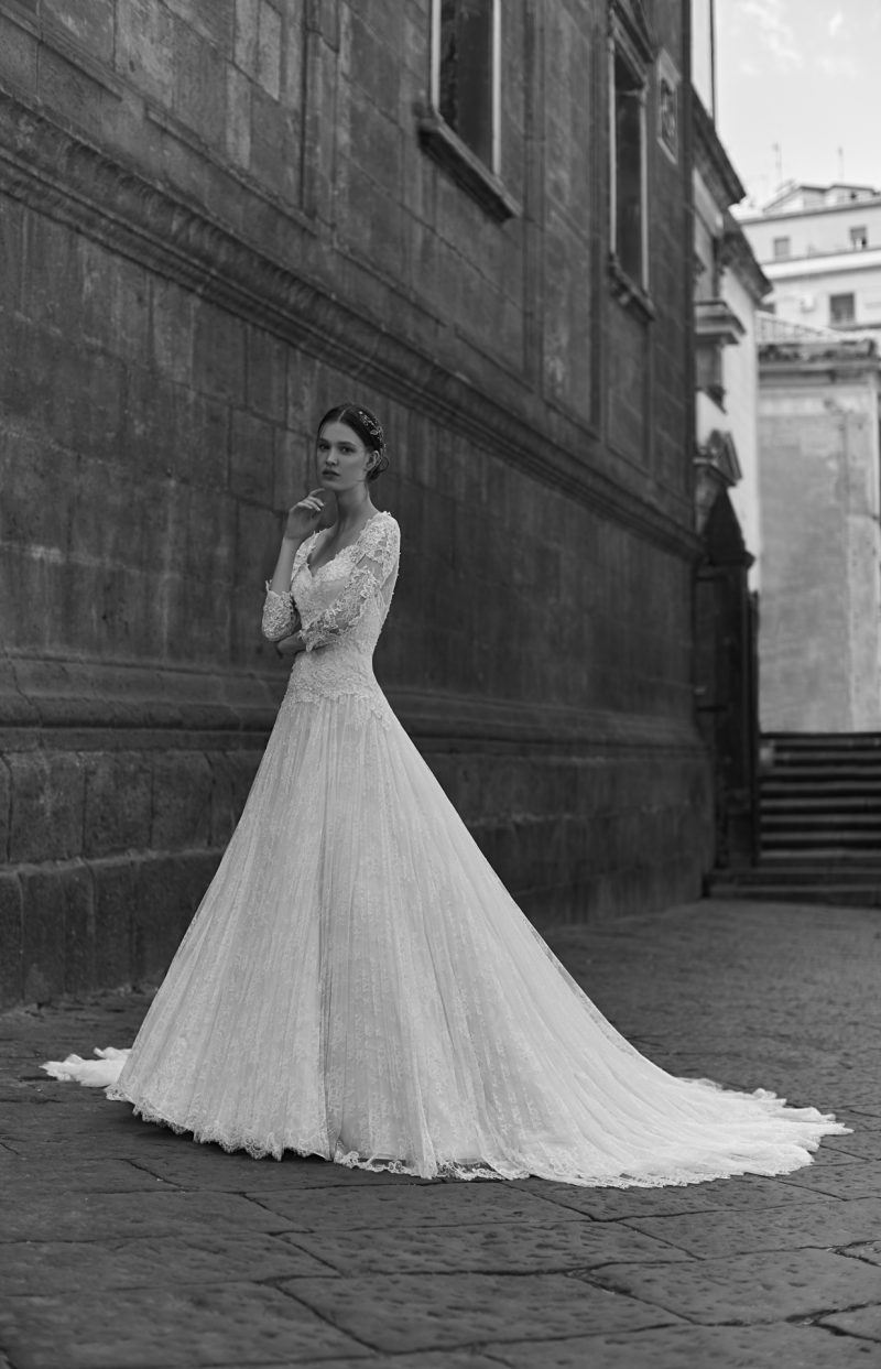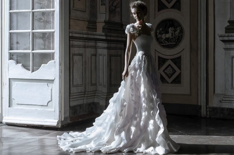 Abito con preziosi ricami e ampia coda staccabile.