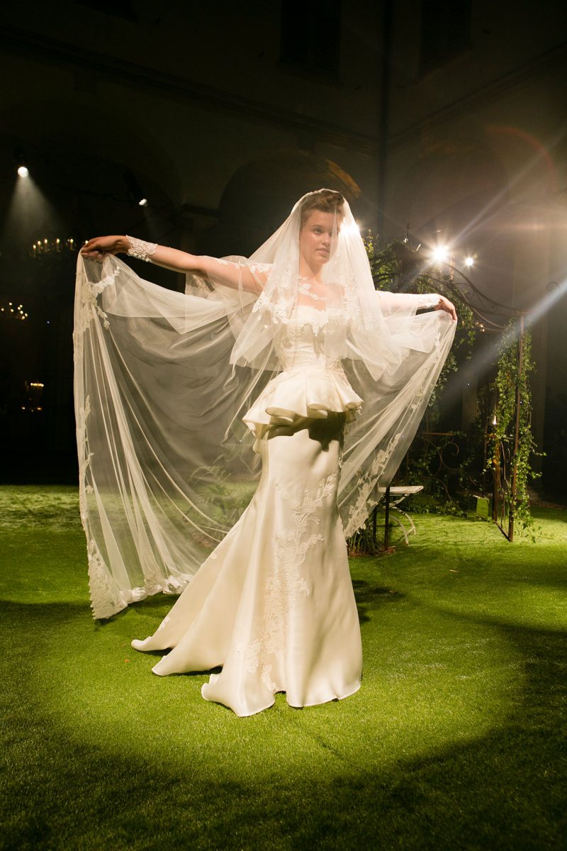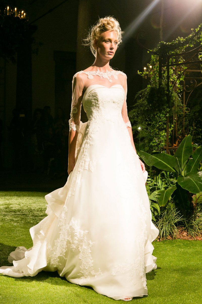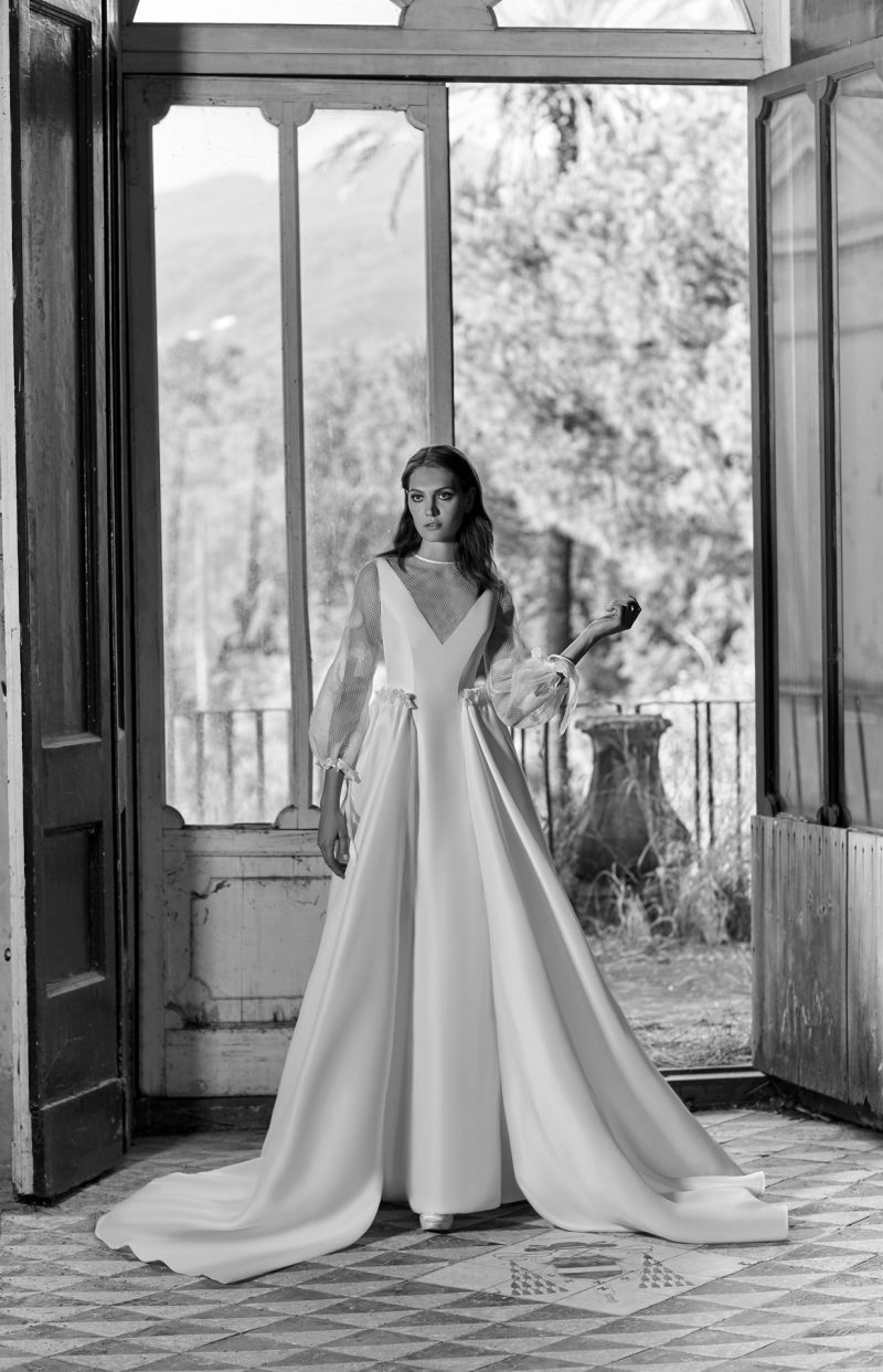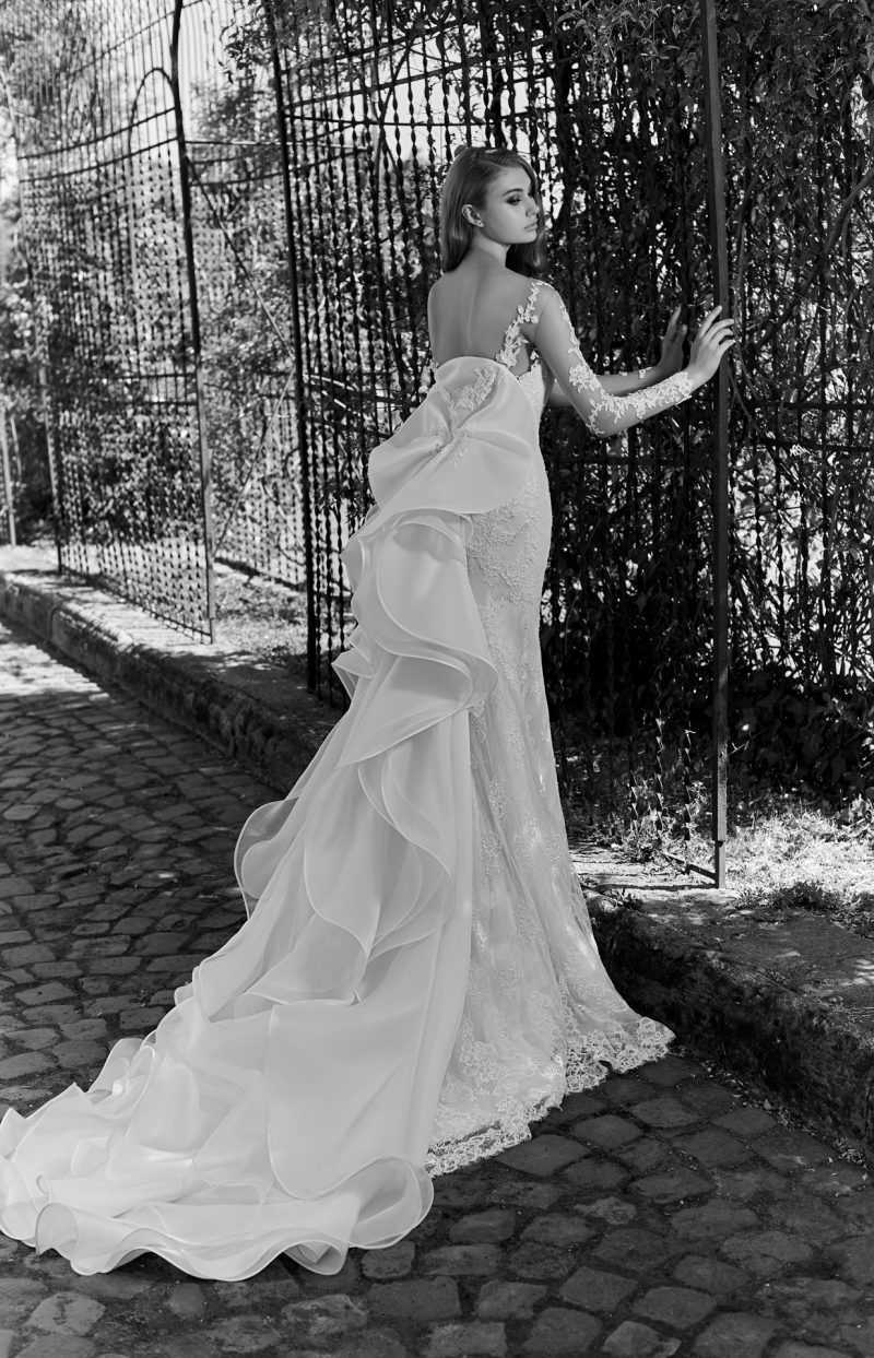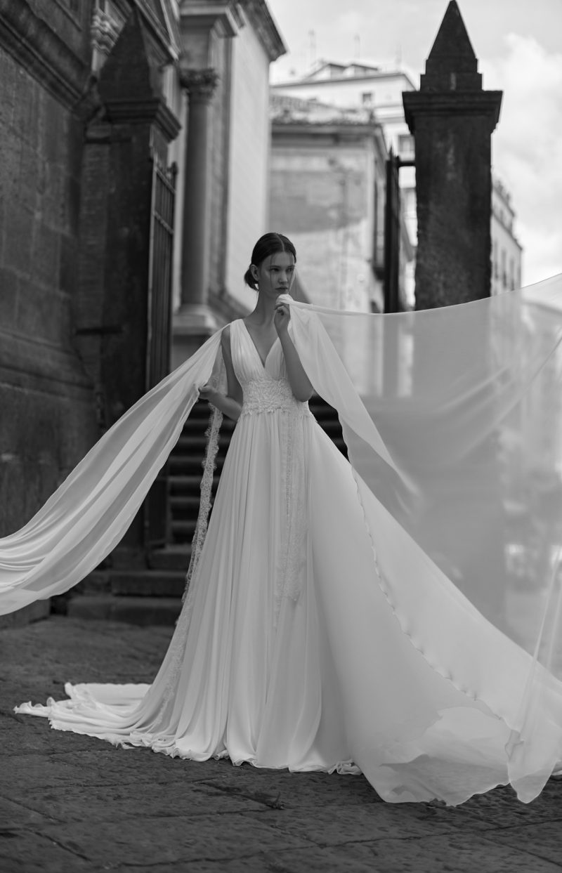 Abito con preziosi ricami e ampia coda staccabile.