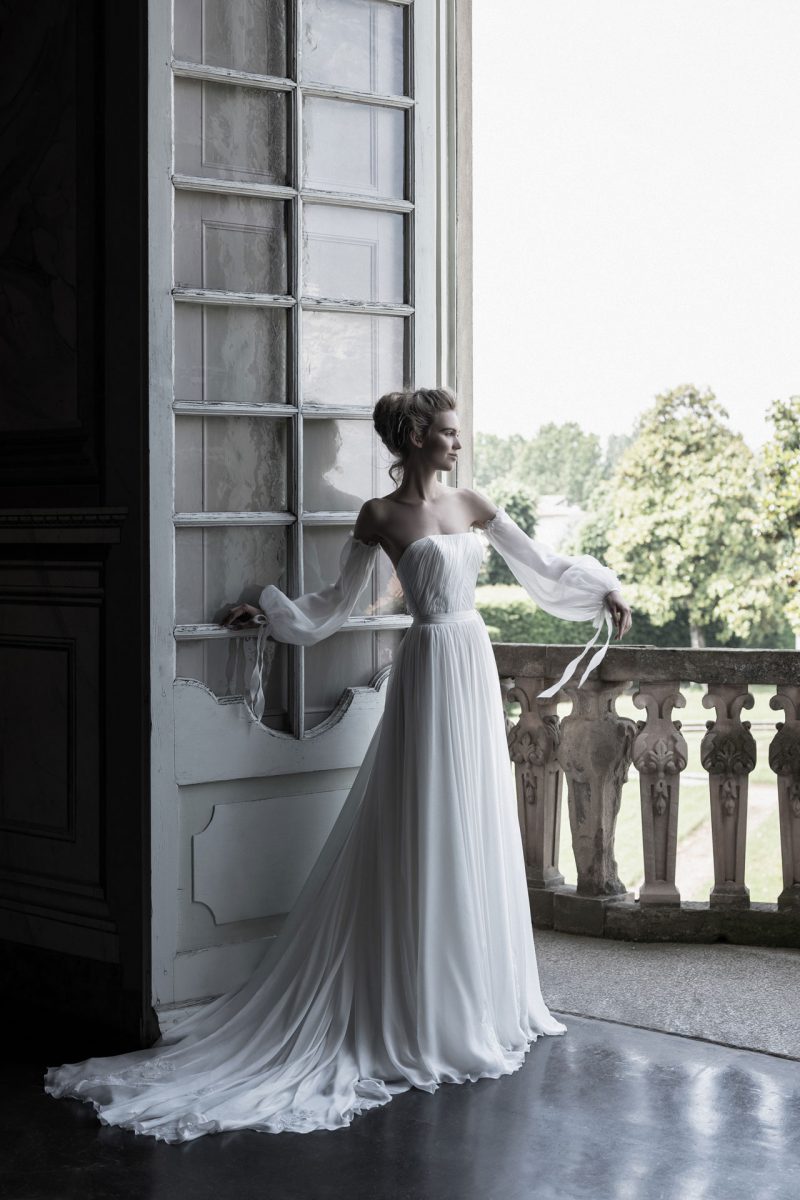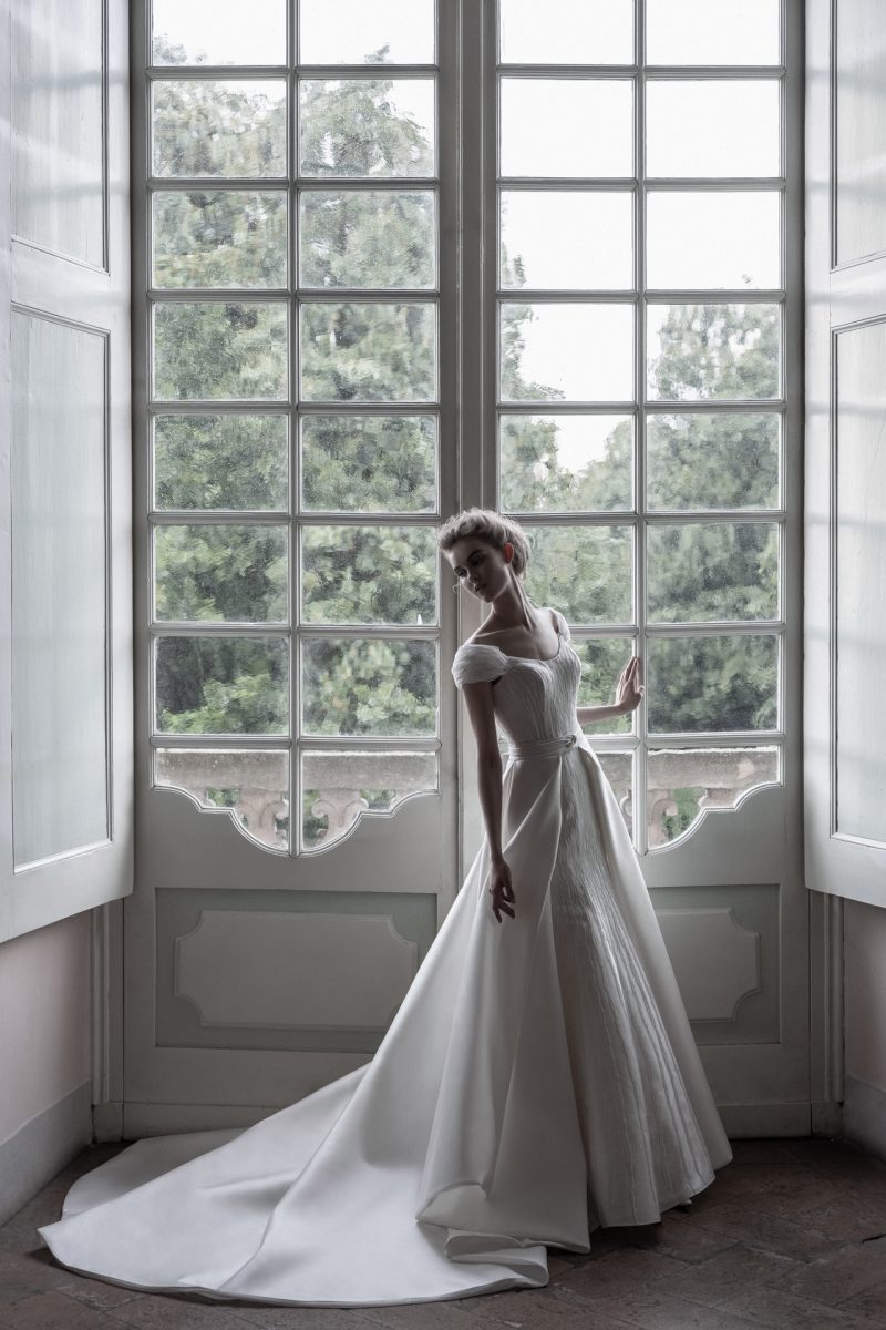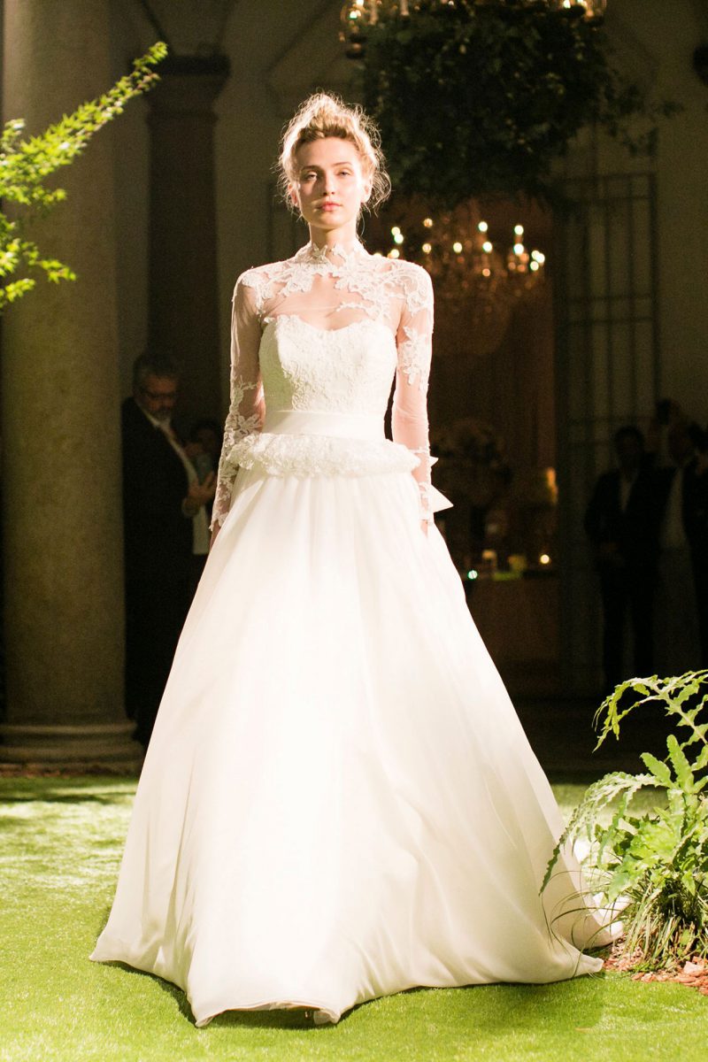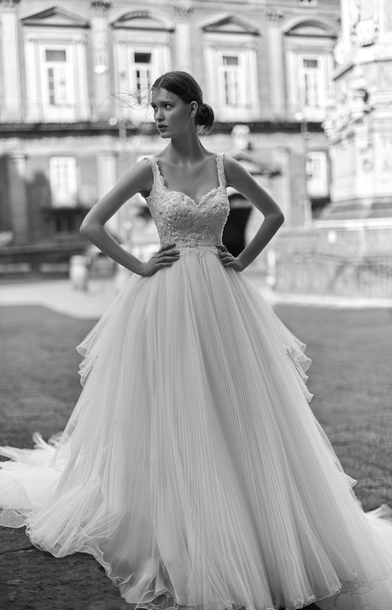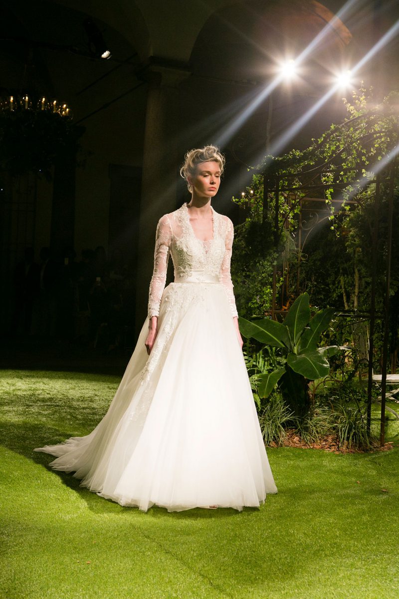 Abito con preziosi ricami e ampia coda staccabile.