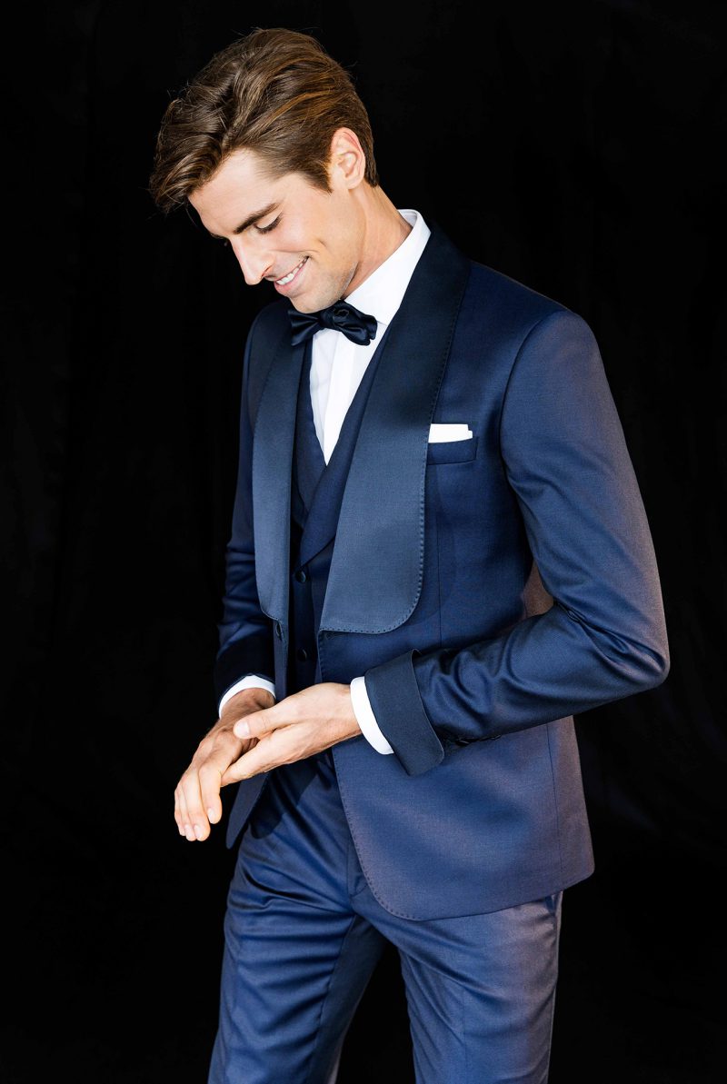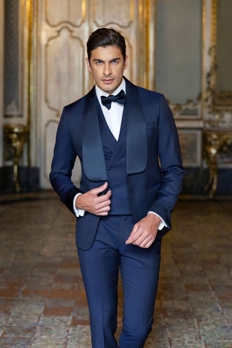Smoking blu notte con revers a scialle. Revers e polsini della giacca in contrasto. Gilet doppio petto. Bottoni rivestiti ton sur ton.