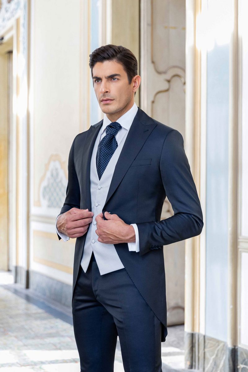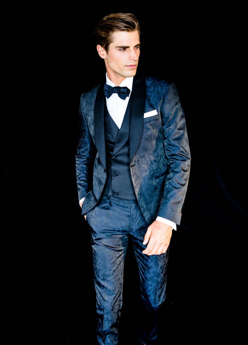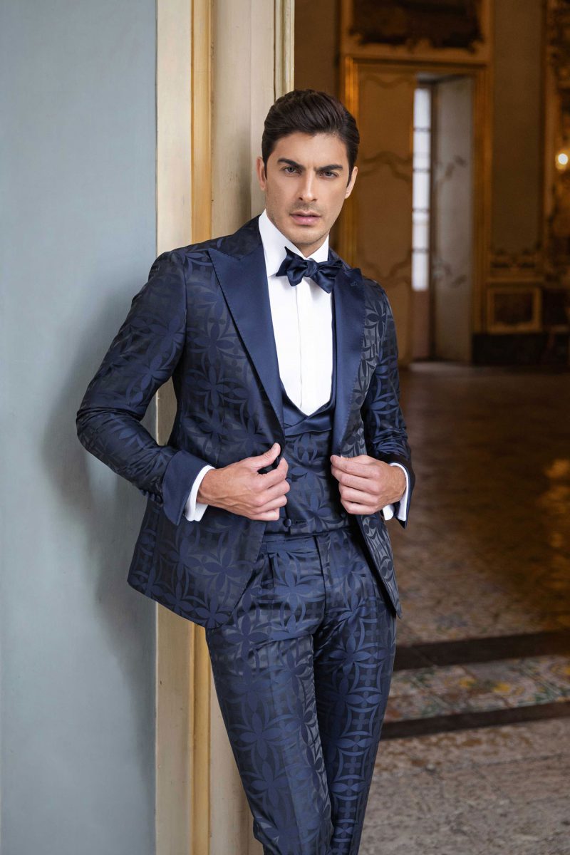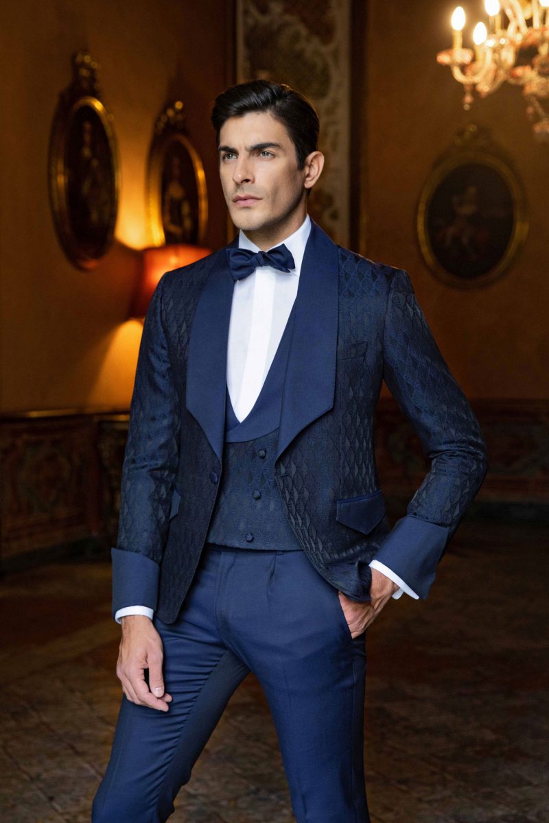 Smoking blu notte con texture geometrica. Rever a lancia e gilet doppio petto con bottoni rivestiti ton sur ton.
