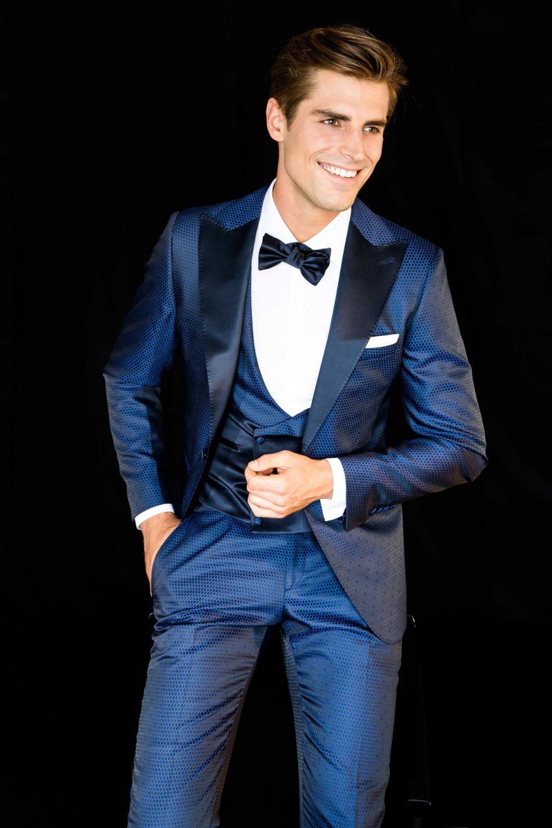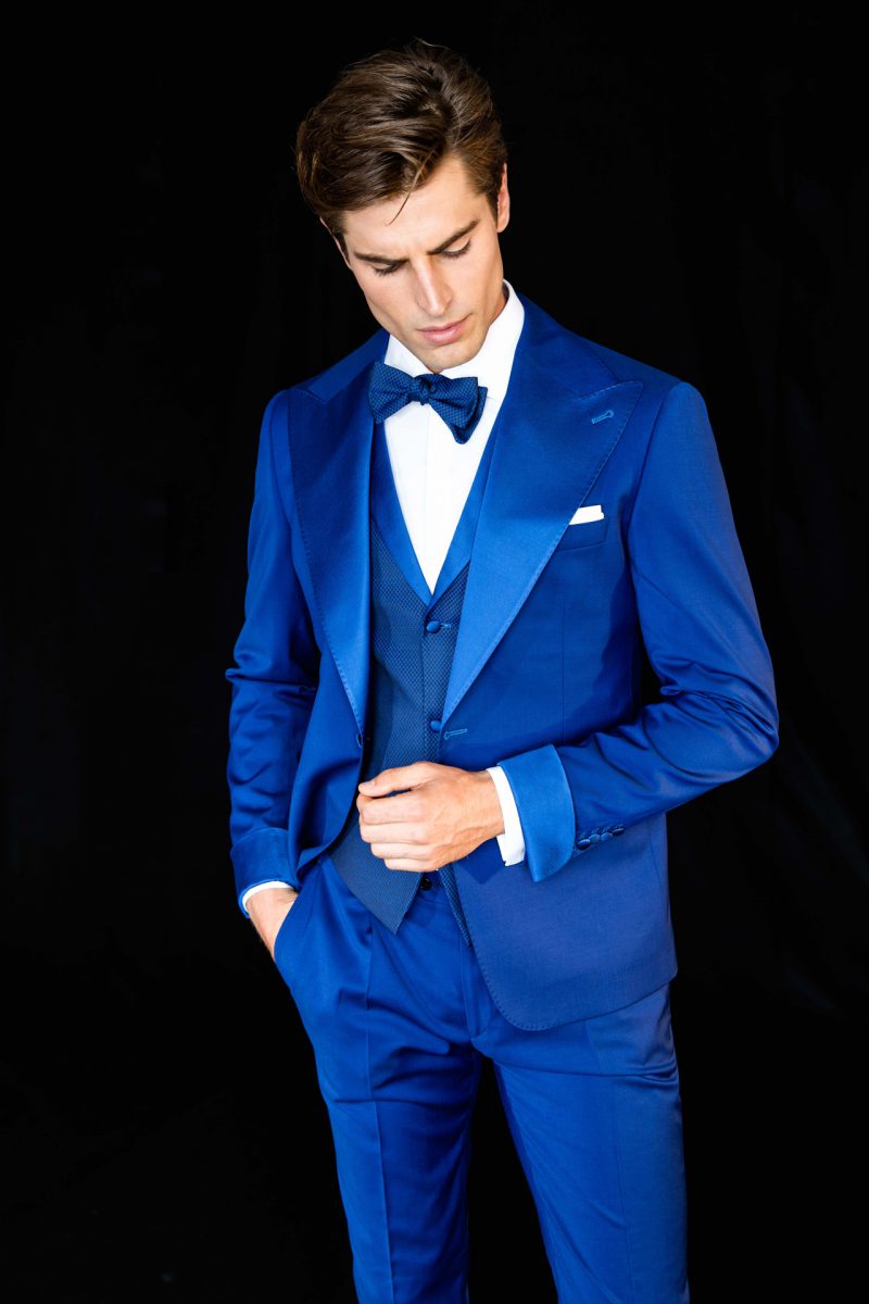 Smoking blu cobalto con revers a lancia e polsini in contrasto ton sur ton. Gilet tre bottoni con micro pattern geometrico. Bottoni rivestiti ton sur ton.