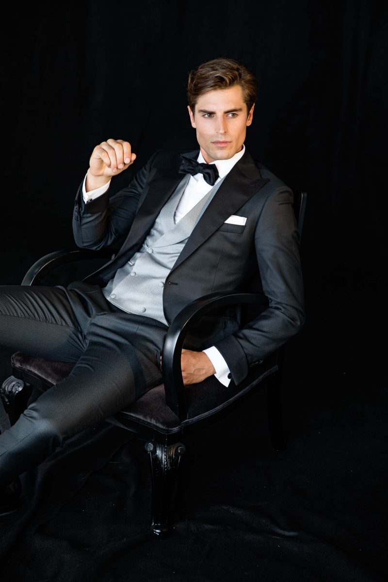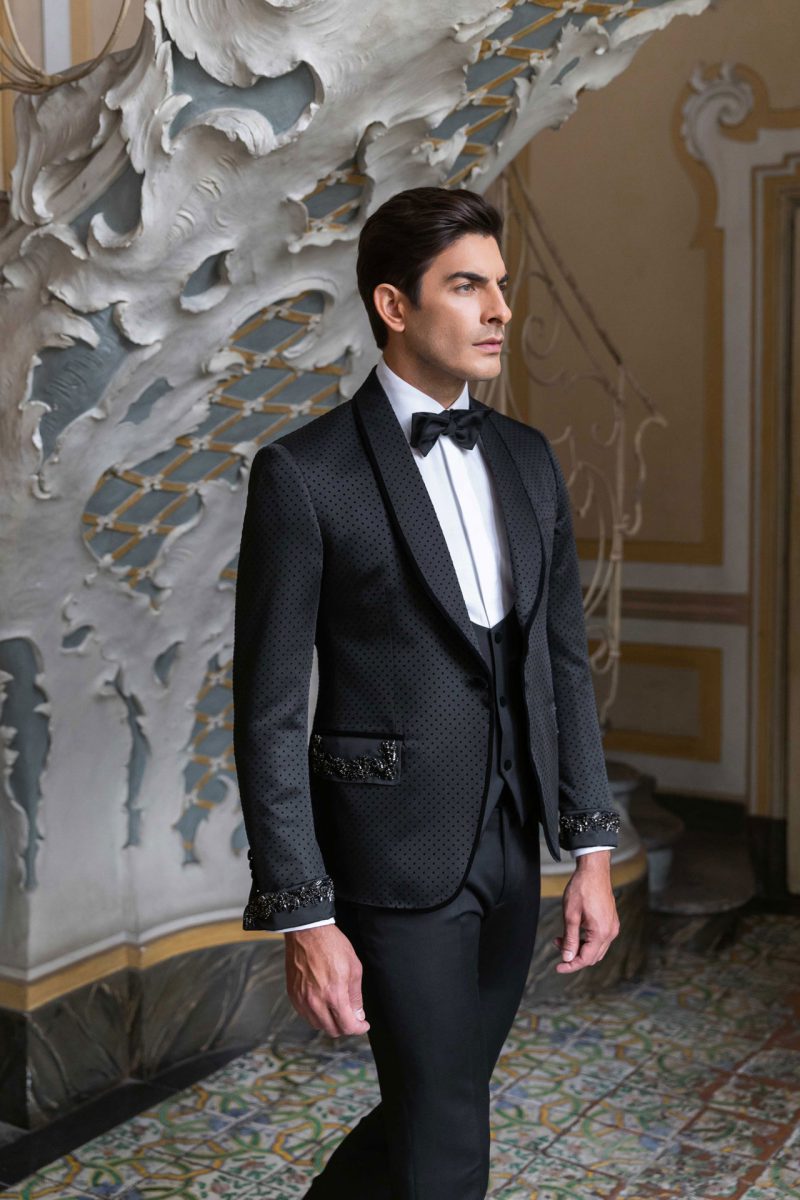 Smoking nero con rever a lancia e bottoni rivestiti ton sur ton. Giacca smoking con micro texture in rilievo. Gilet tre bottoni.