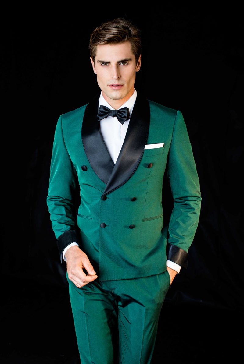 Abito uomo doppio petto verde con rever nero e polsini in contrasto, colore nero. Bottoni neri rivestiti.