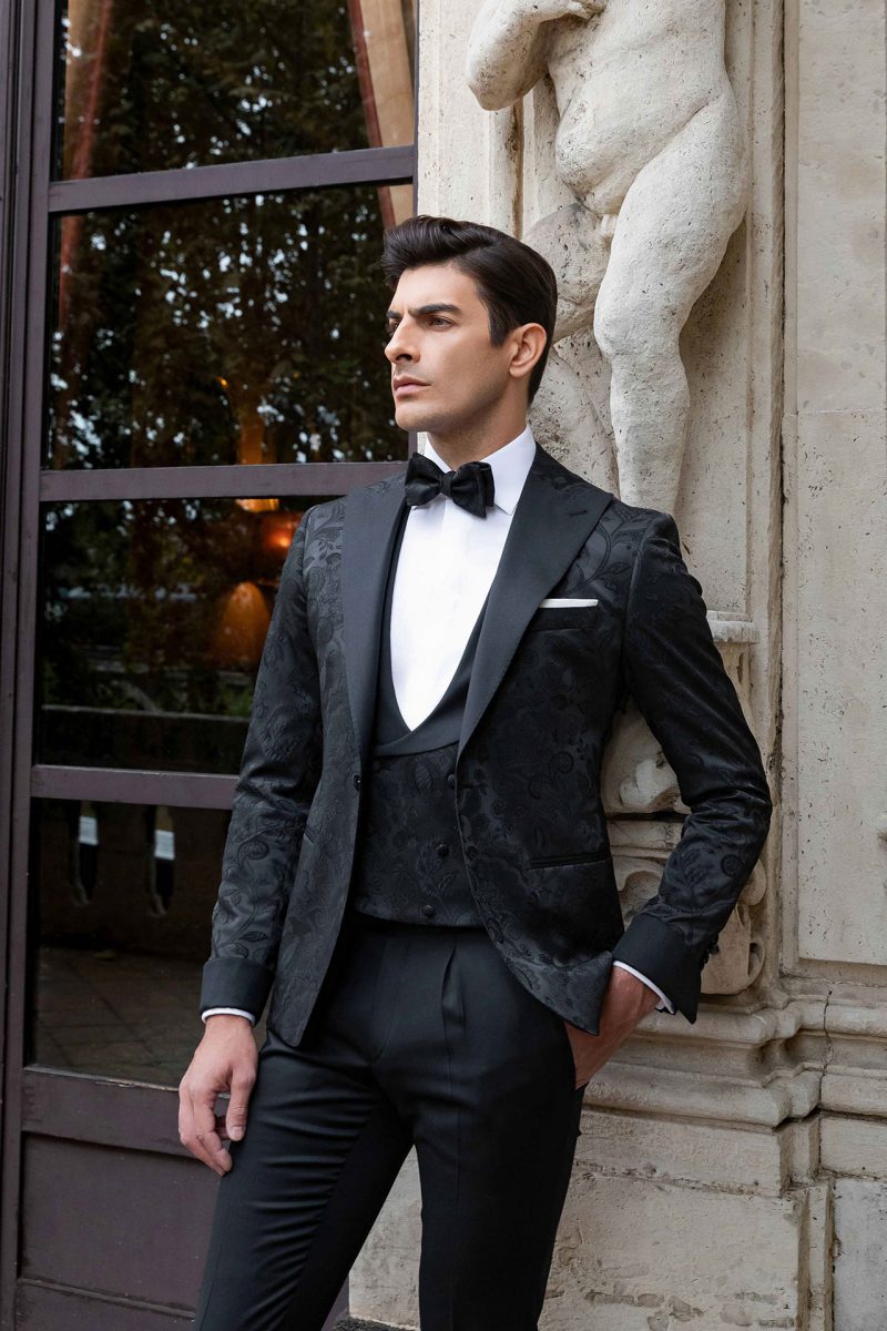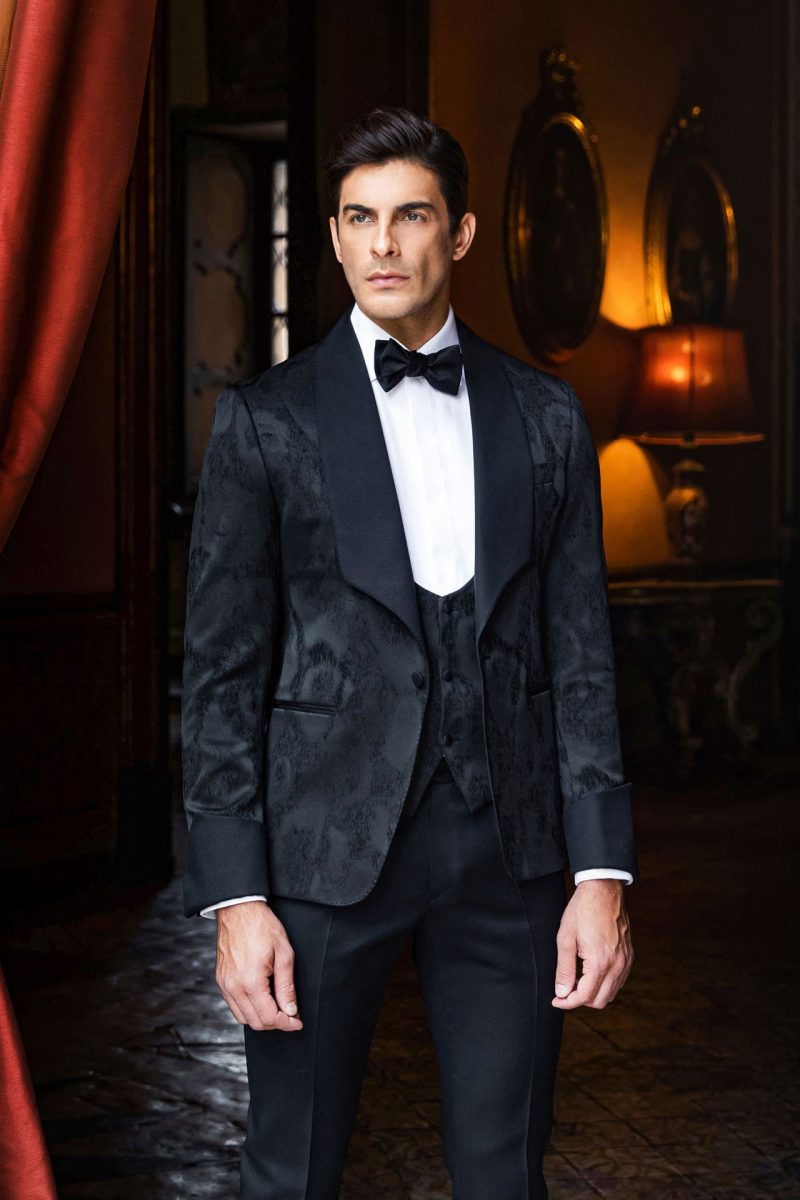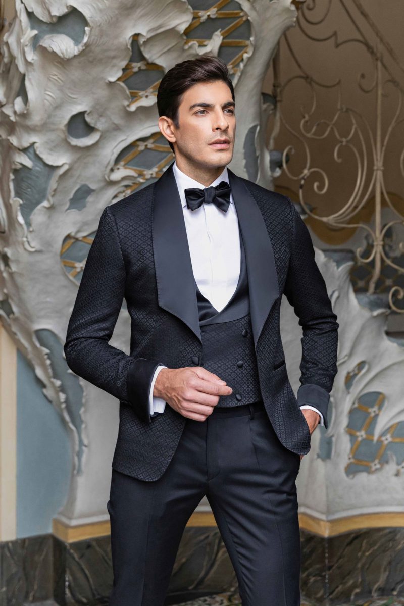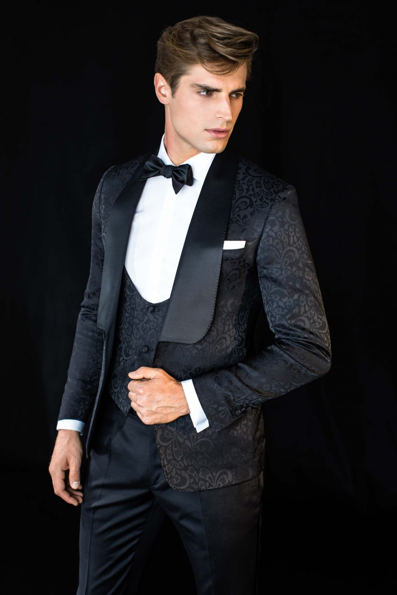 Smoking nero con revers a lancia.Giacca smoking con pattern paisley ton sur ton e bottoni rivestiti. Gilet doppiopetto, polsini e revers in raso nero.