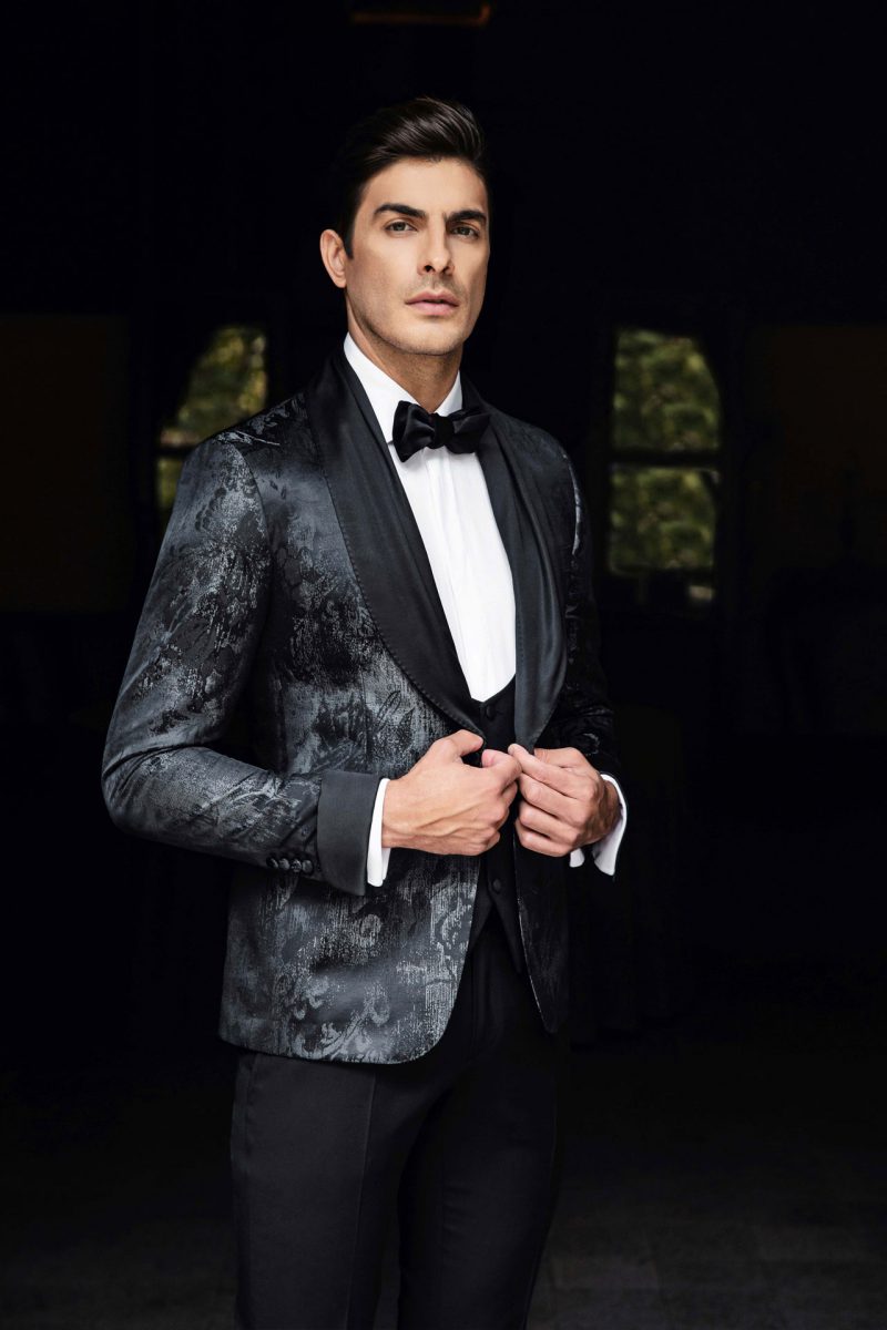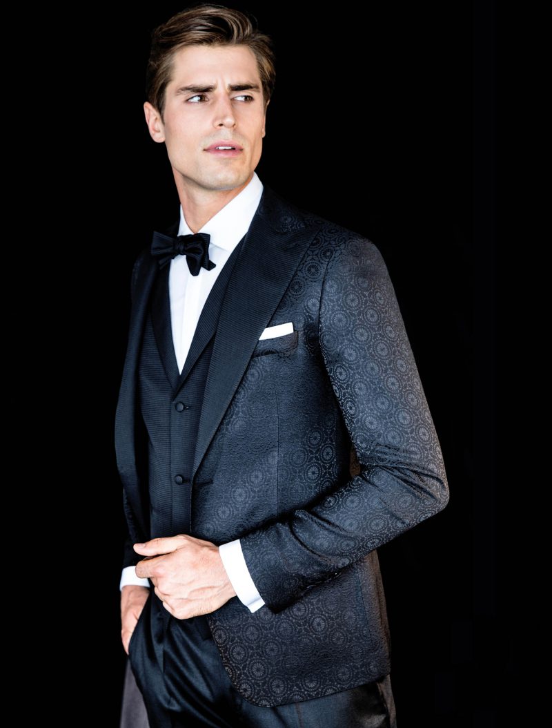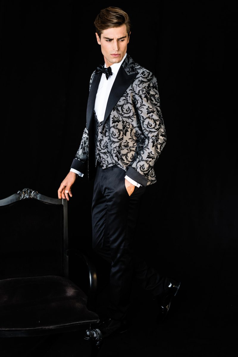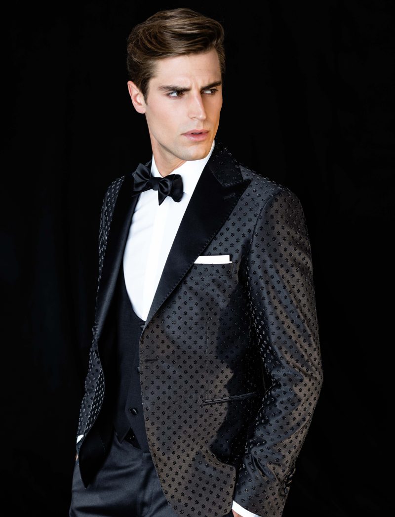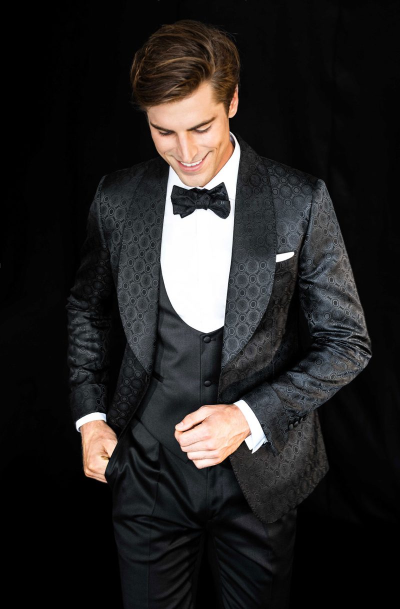 Smoking nero con revers a lancia.Giacca smoking con pattern paisley ton sur ton e bottoni rivestiti. Gilet doppiopetto, polsini e revers in raso nero.