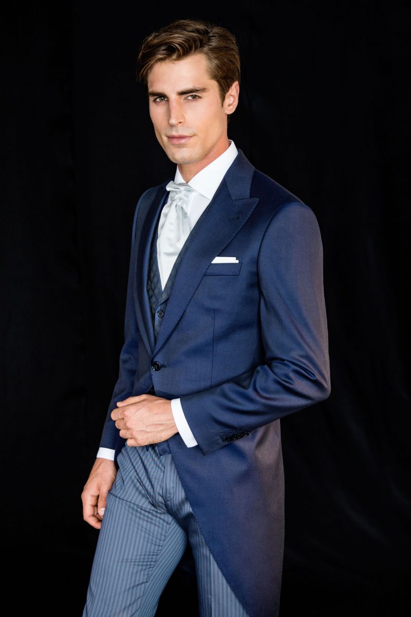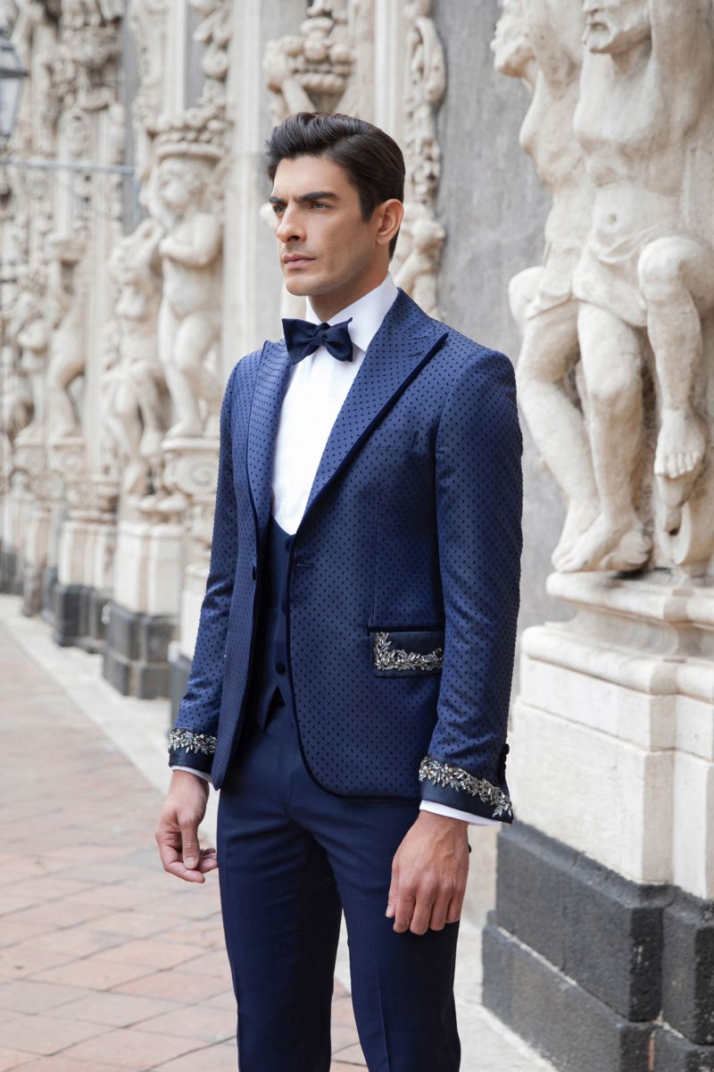Raffinato abito blu con revers a lancia in tessuto floccato. Gilet e pantalone in contrasto. Polsini e tasche con applicazioni gioiello.
