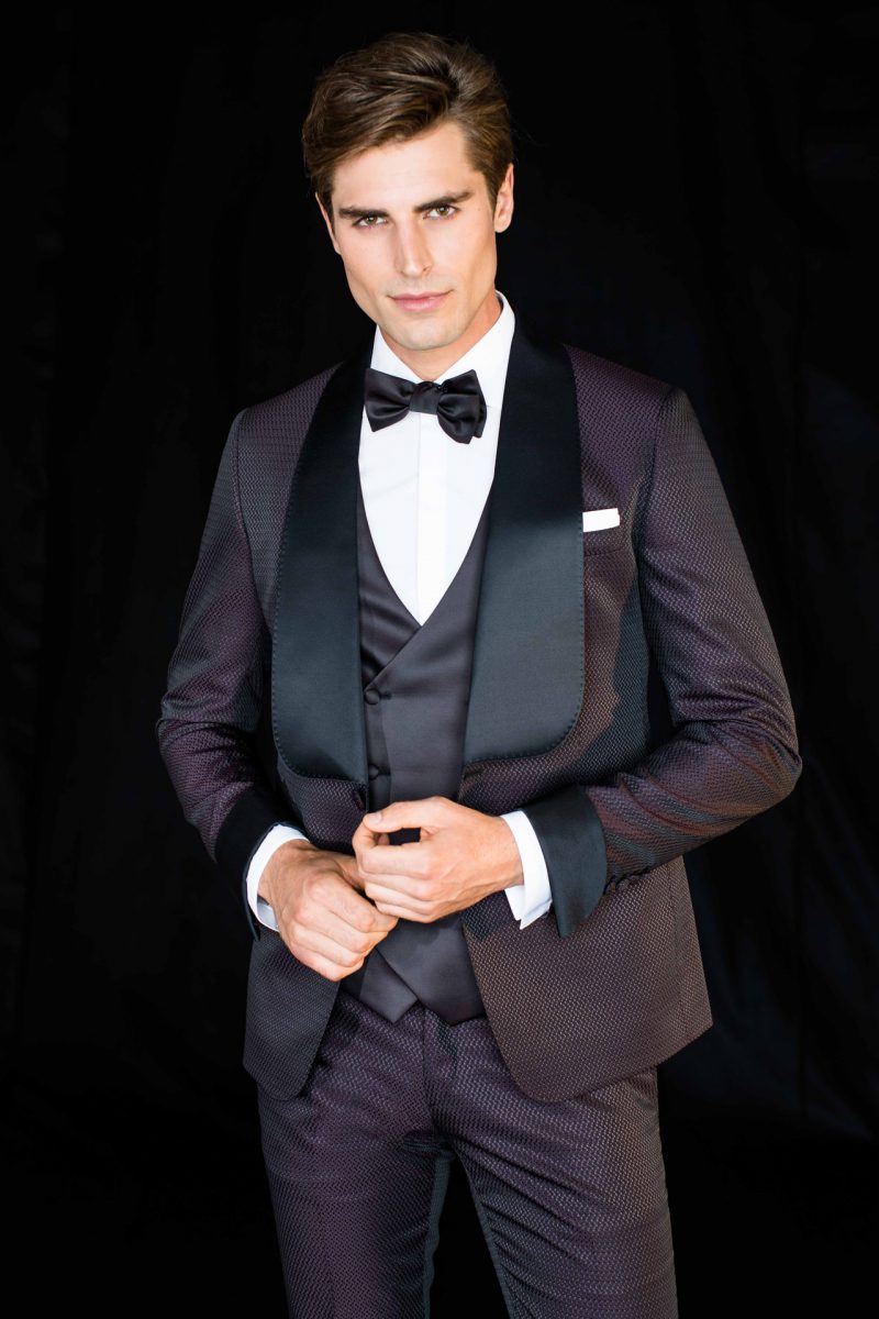 Smoking con sofisticati revers a scialle. Giacca smoking con texture camouflage. Polsini e revers in contrasto.