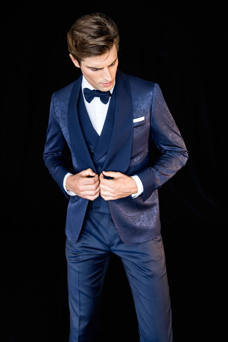 Smoking uomo blu notte con rever a scialle. Giacca e pantalone smoking con pattern paisley. Gilet doppio petto con bottoni rivestiti, ton sur ton.