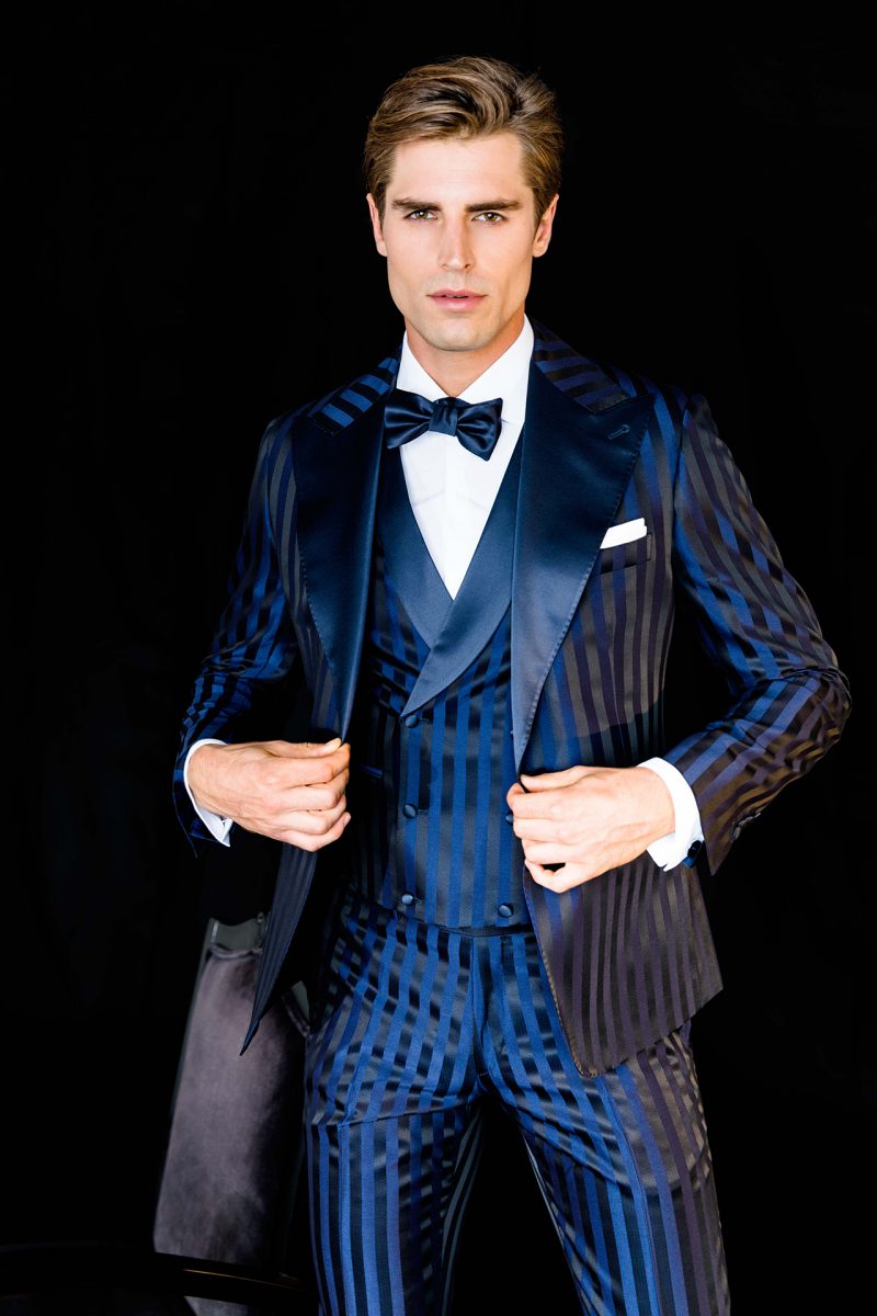 Smoking blu notte in raso gessato, con rever a lancia in contrasto. Gilet doppio petto gessato con collo in contrasto. Bottoni rivestiti ton sur ton.