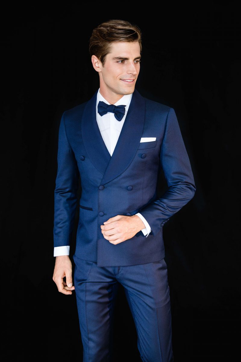 Abito uomo doppio petto con rever a scialle. Colore blu cobalto. Bottoni rivestiti ton sur ton.