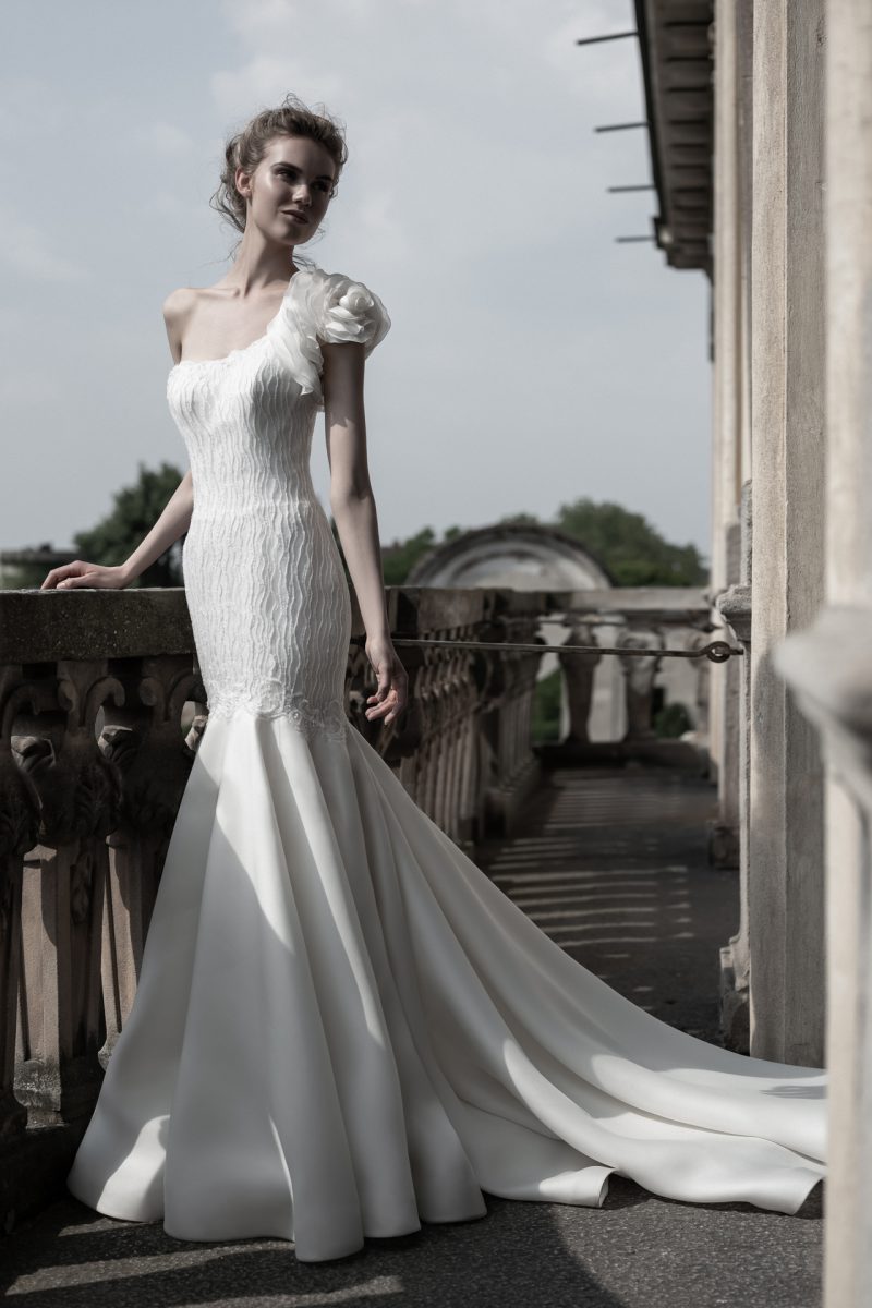Abito monospalla impreziosito da ricami e importante fiore sulla spalla.