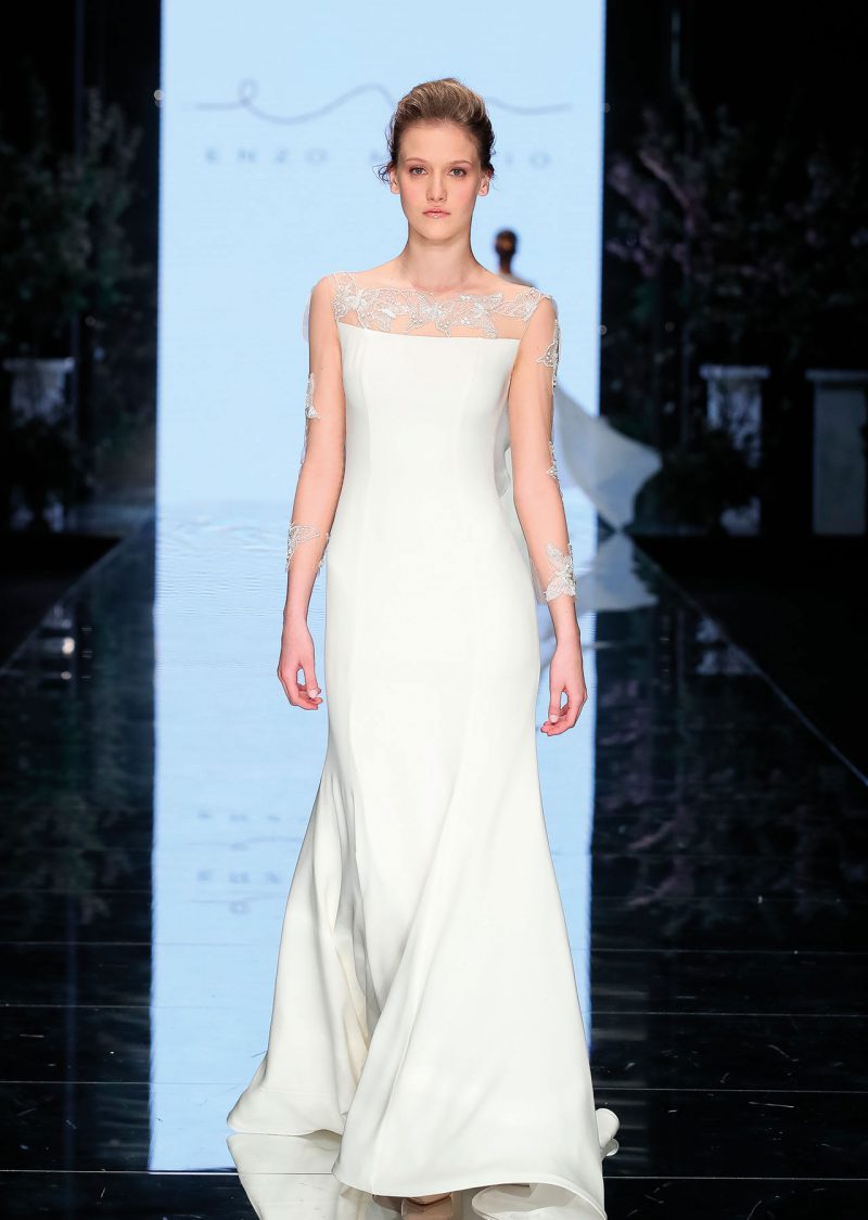 Abito sirena con maniche e scollo impreziositi da ricami gioiello.