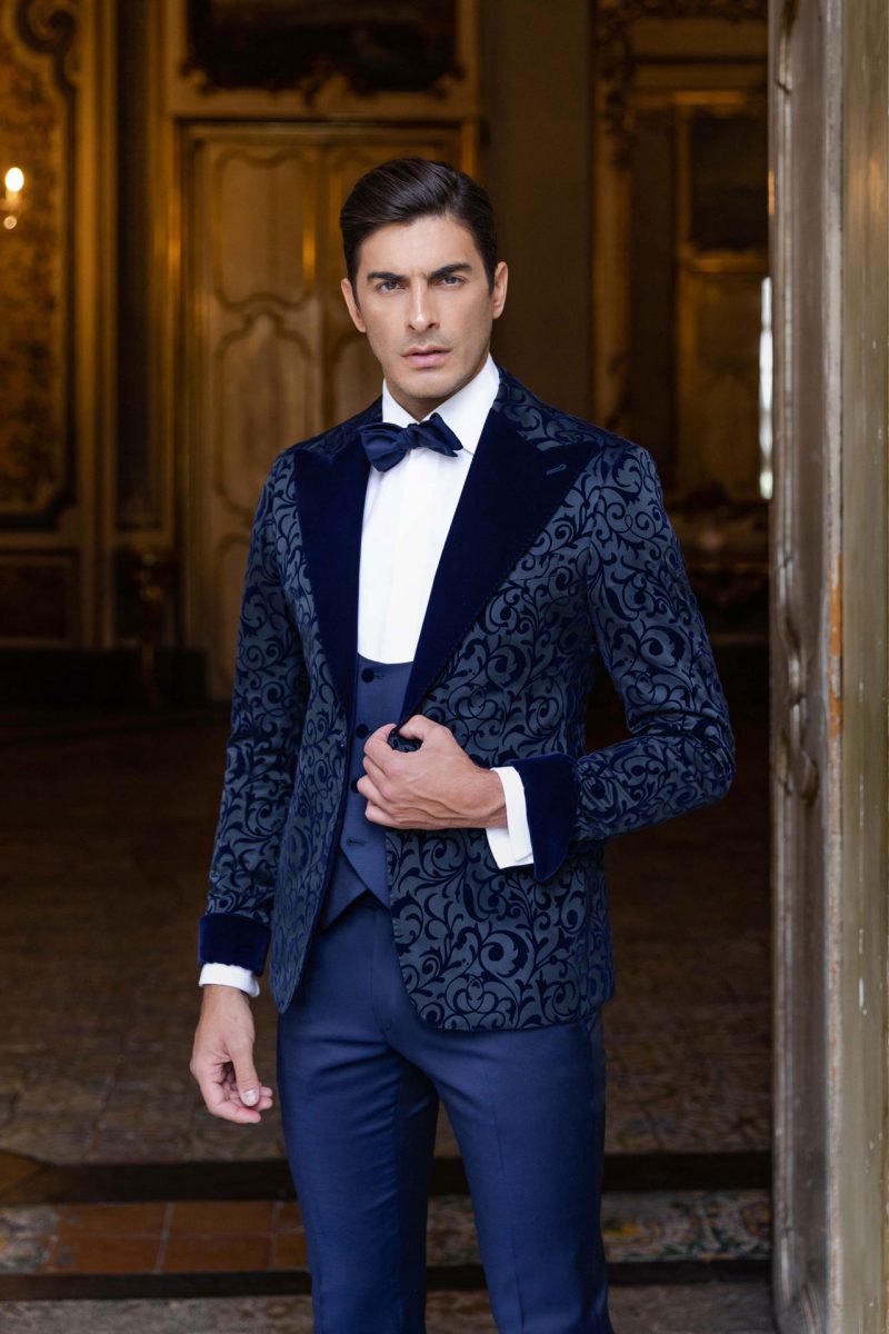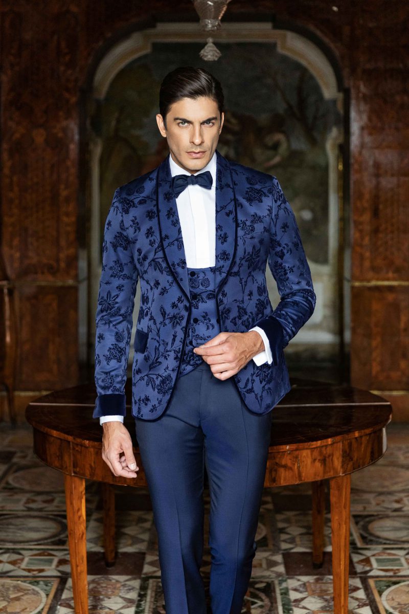 Smoking blu con giacca in pregiato tessuto floccato. Pantalone e gilet in contrasto. Revers e polsini in velluto liscio blu notte.