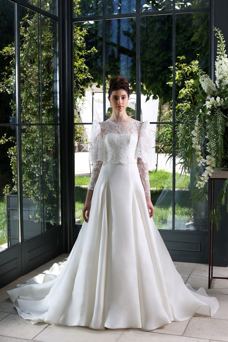 Romantico abito ampio con inserti in pizzo e gonna staccabile.