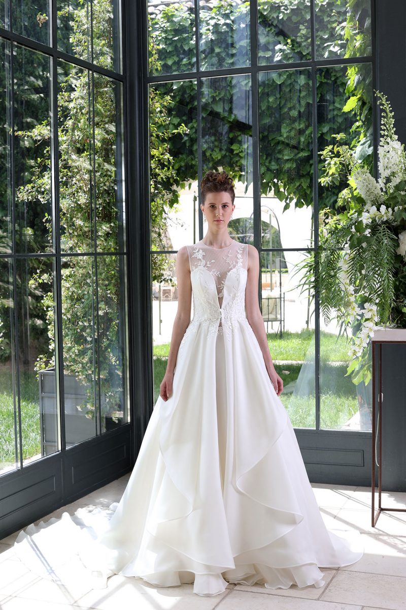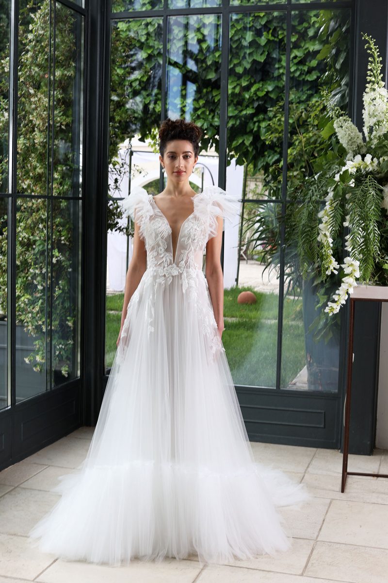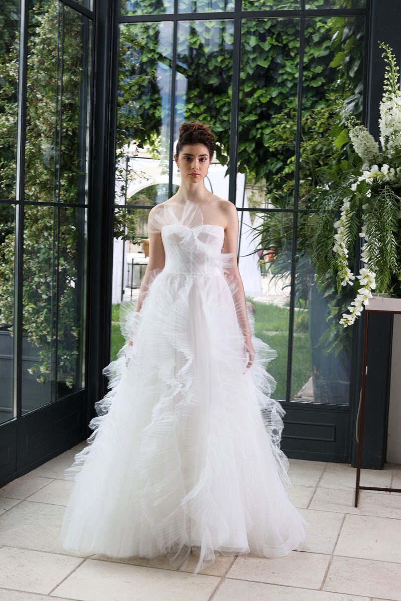 Abito con volant sul decolleté e ricamo tridimensionale. Leggerissima gonna staccabile.
